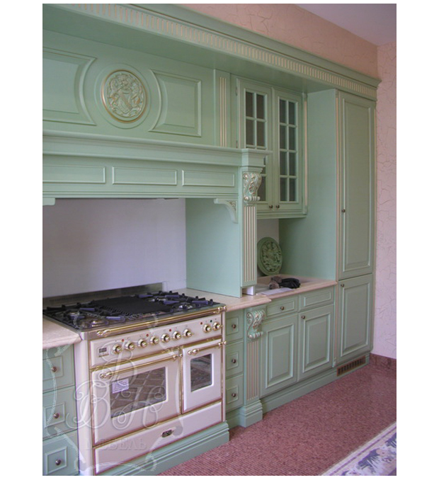 Роскошная кухня в классическом стиле представлена в нежном салатовом цвете с золотистыми узорами. Линейная модель оснащена подвесными шкафчиками с застекленными створками и большой нишей для встраиваемой газовой плиты. За счет натурального массива такая кухня не утратит своей функциональности и презентабельного внешнего вида.