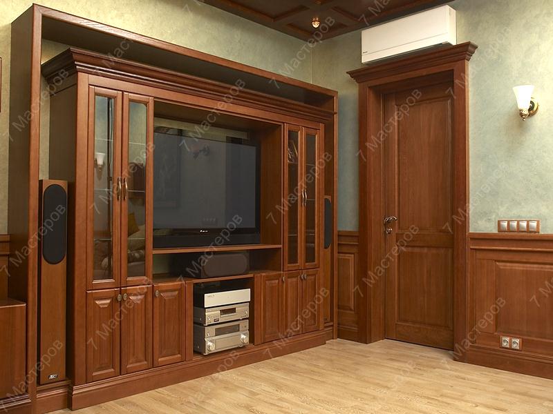 Набор мебели из массива ольхи впечатляюще впишется в интерьер любого помещения. Детальная проработка и фрезеровка фасадов позволила придать им собственную неповторимую индивидуальность. Деревянные панели на стенах окаймлены тонкими филенками, которые подчеркивают детальность и четкость фрезеровки. Функциональная стенка с остекленными створками обладает большой секций для ТВ, а также отделениями для размещения телевизионной техники.