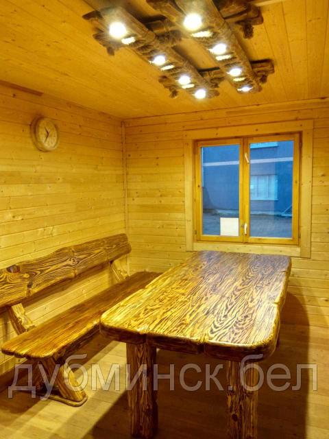 В комплект входит: светильник, стол и скамейка. Материал: массив.