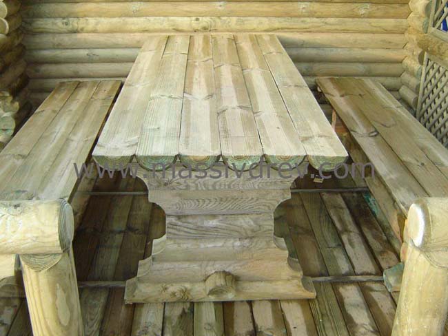 Набор мебели из срубов можно поставить как на улице, так и внутри беседки. Опора столешницы изготовлена из срубов сосны разной длины, тем самым подчеркивая привлекательный внешний вид. Модели скамеек без спинок, но это совершенно не делает их менее удобными.