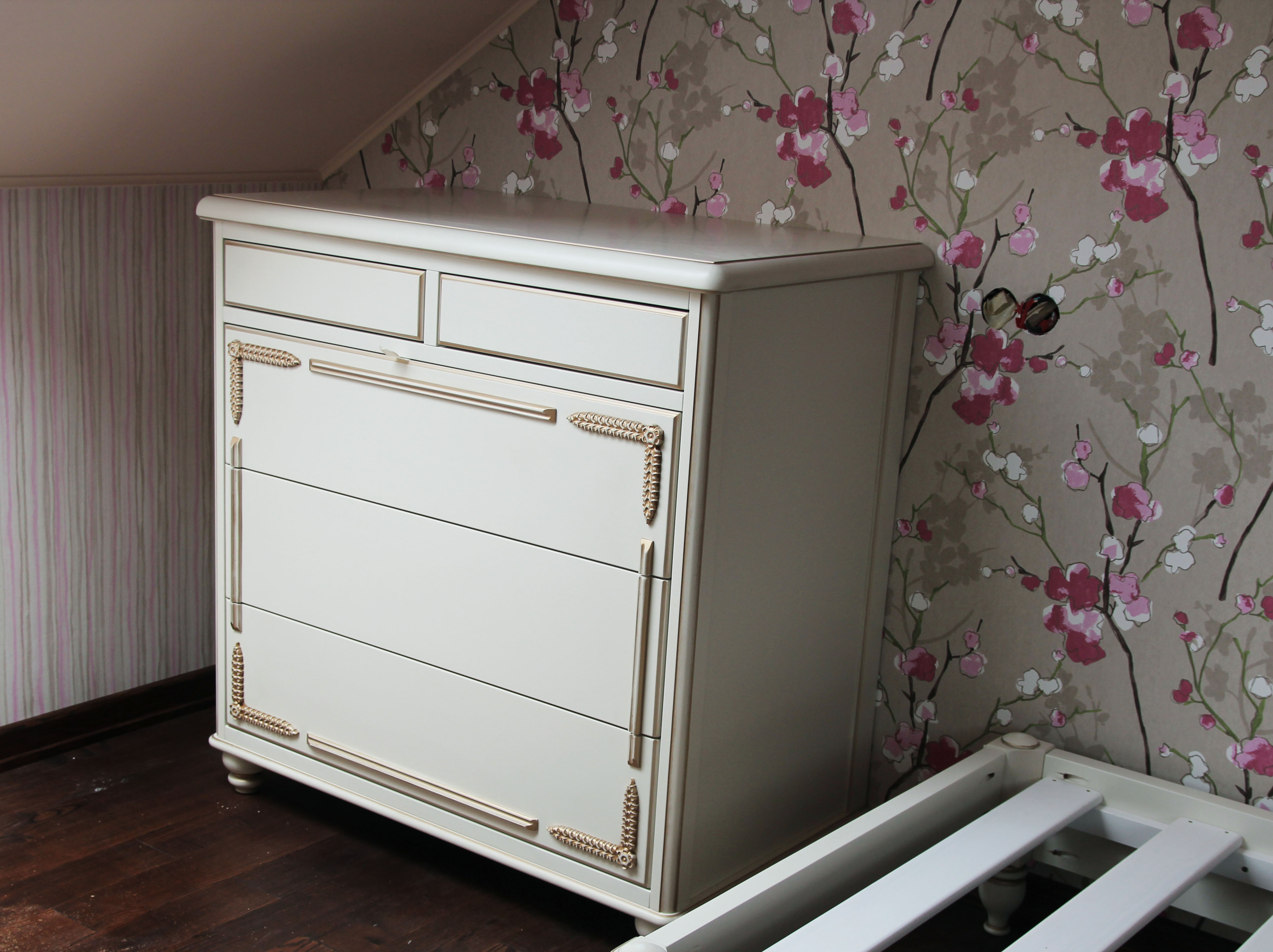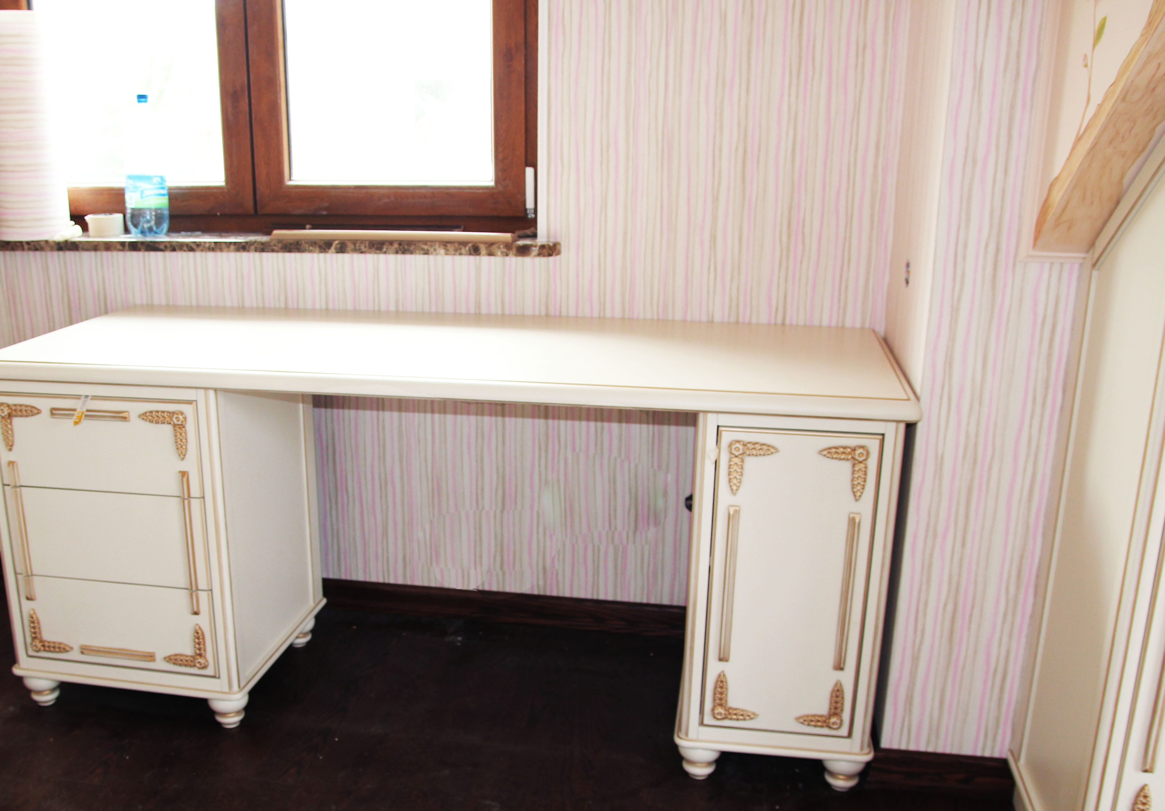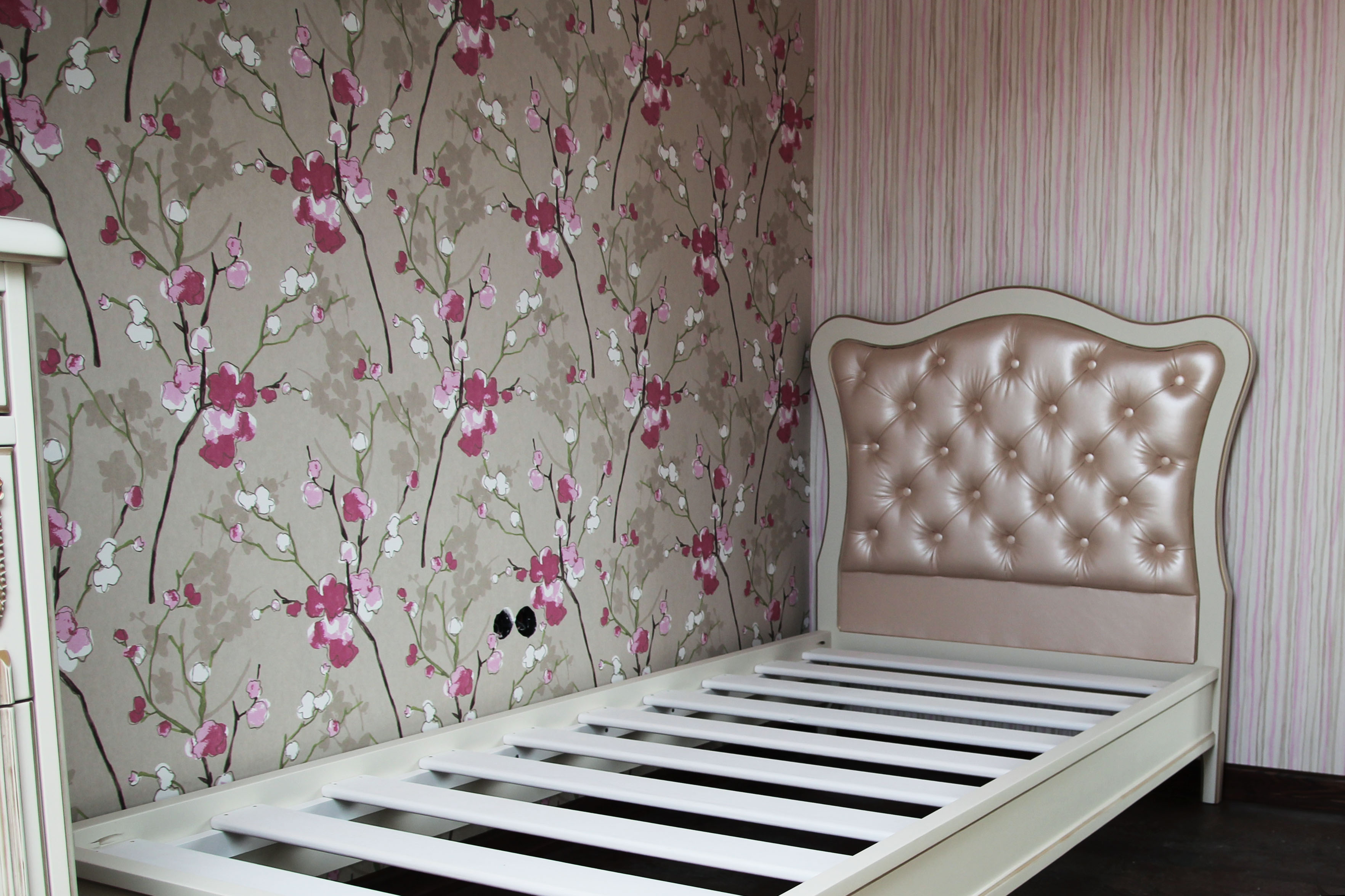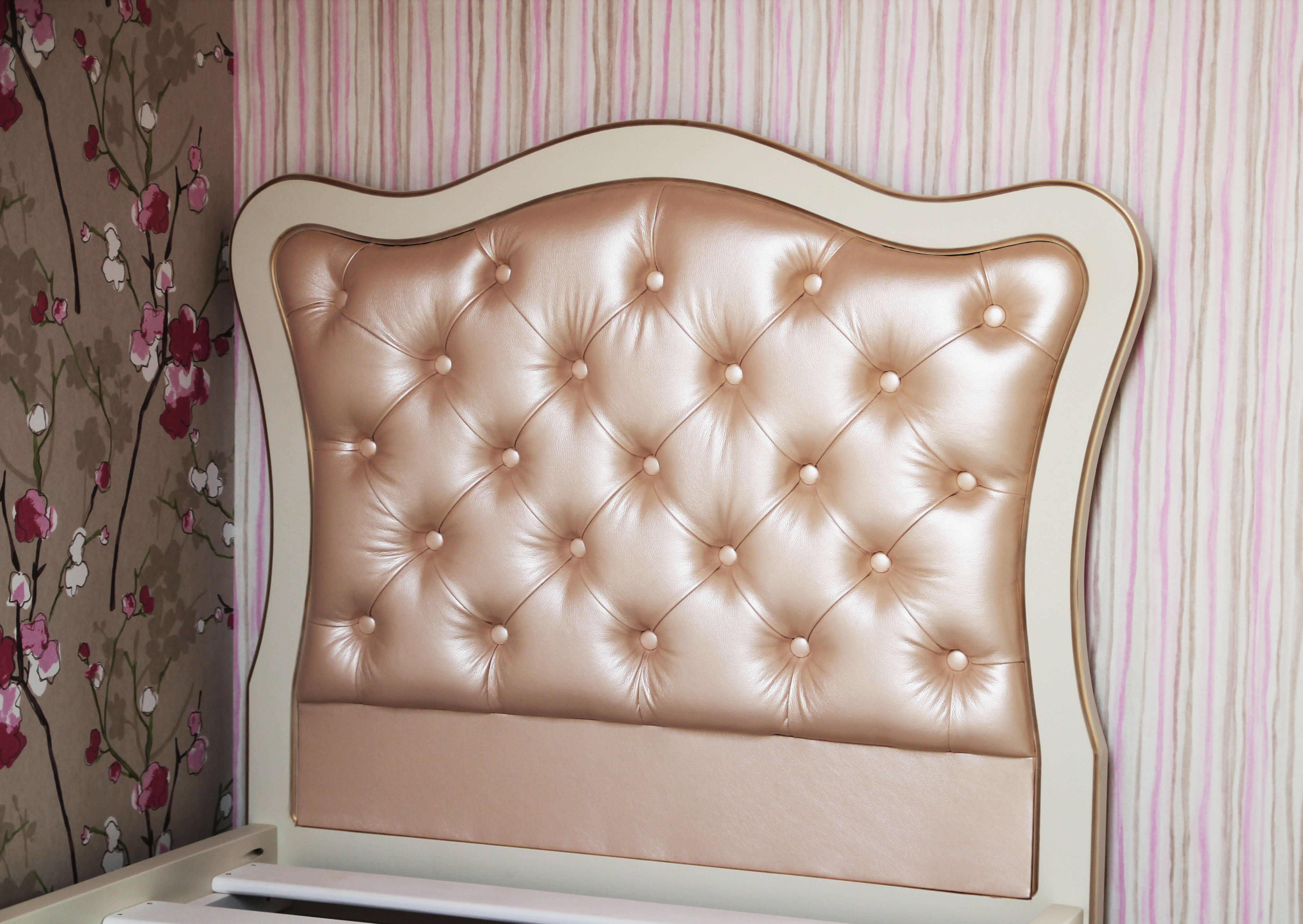 Набор мебели из массива представляет собой изысканное и эффективное решение для комнаты. Фасад выполнен в изящной резной узорчатой инкрустации. Спинка кровати оформлена в пуговицах.