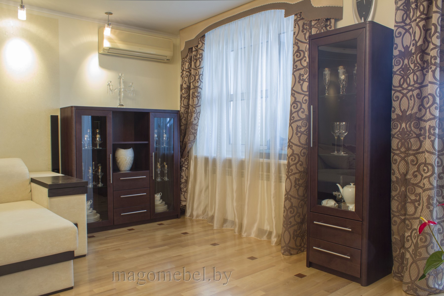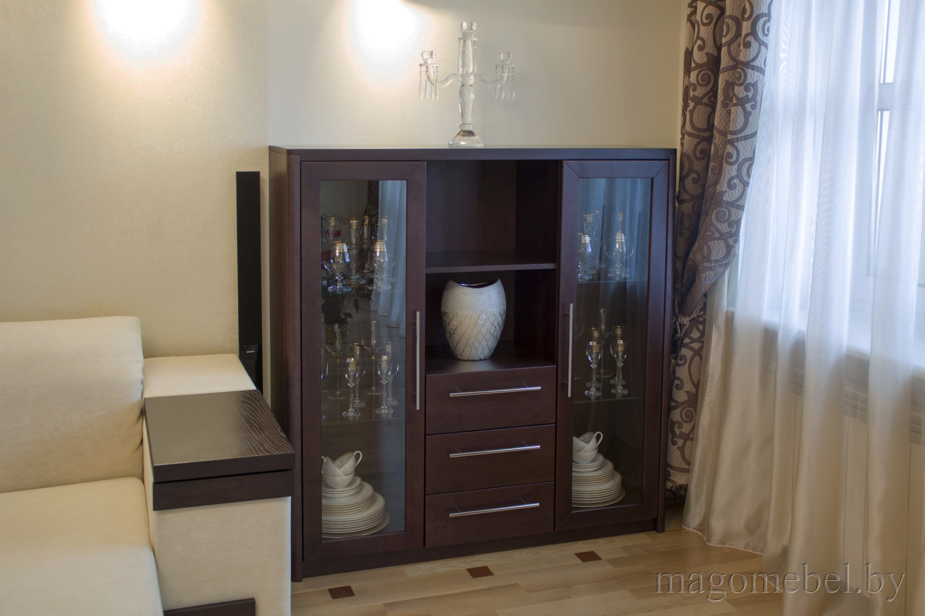 Две чудные витрины для посуды. Стильные прямые линии и стекло - это все что нужно для того чтобы мебель в гостиной заиграла. И конечно натуральное дерево со своим неповторимым шармом.
