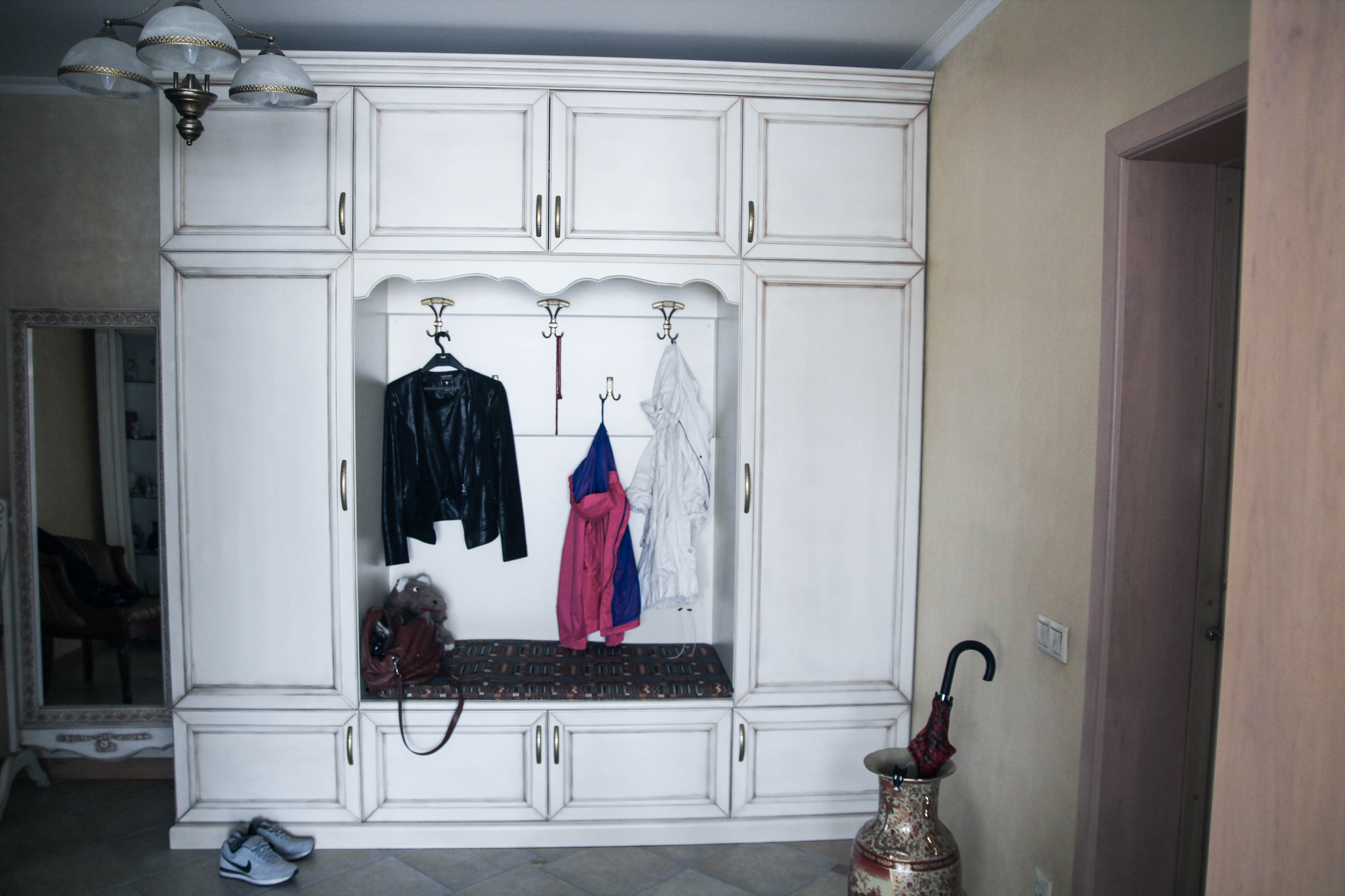 Прихожая оформлена в элегантном белом цвете с использованием массивной балки, визуально придающей модели массивный вид. В прихожей предусмотрены шкафы как для верхней одежды, так и для обуви и головных уборов, что, несомненно, является большим преимуществом изделия. Блестящие вешалки оборудованы двумя крючками. Ручки дугообразной формы удобны в использовании.