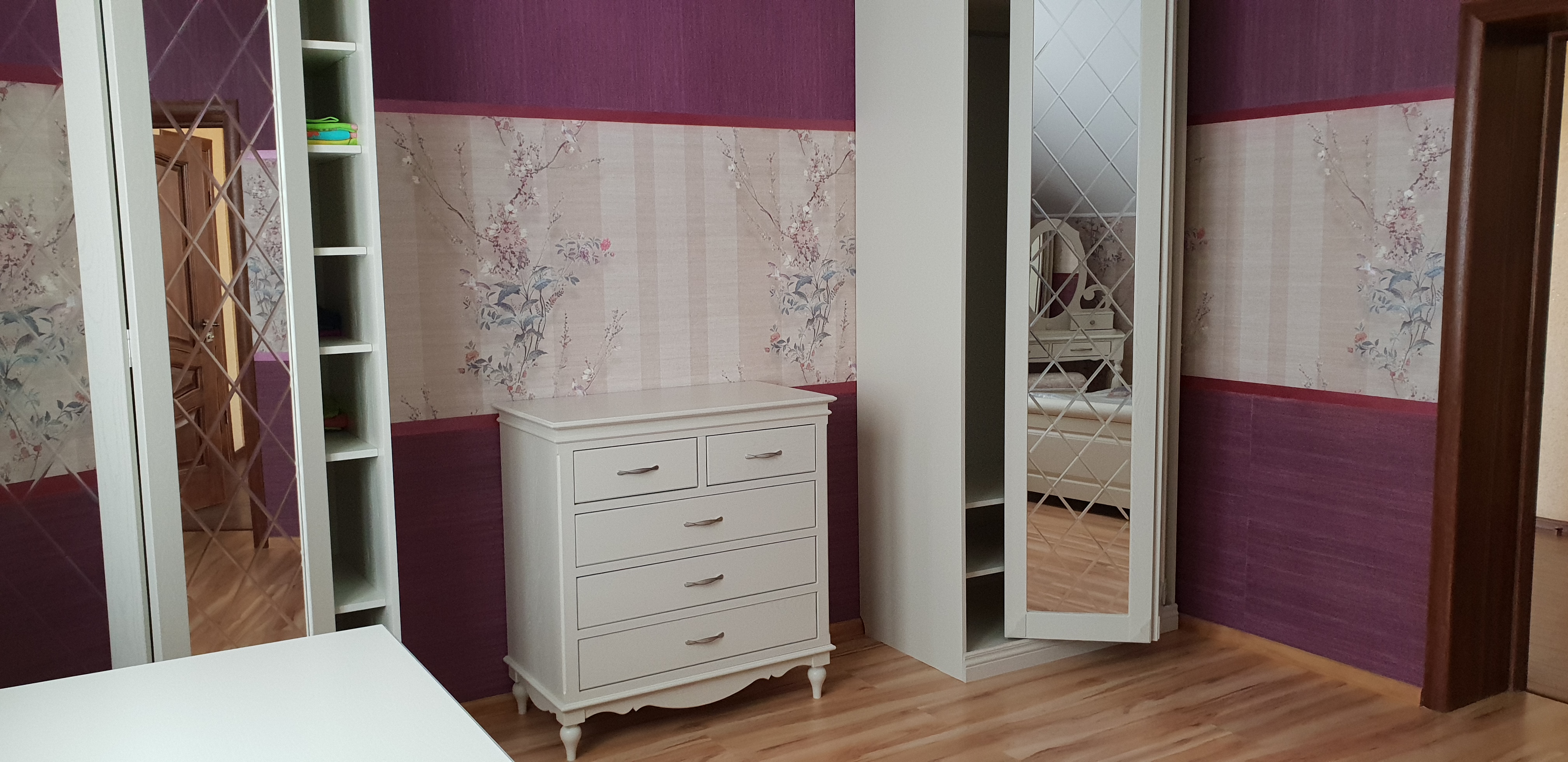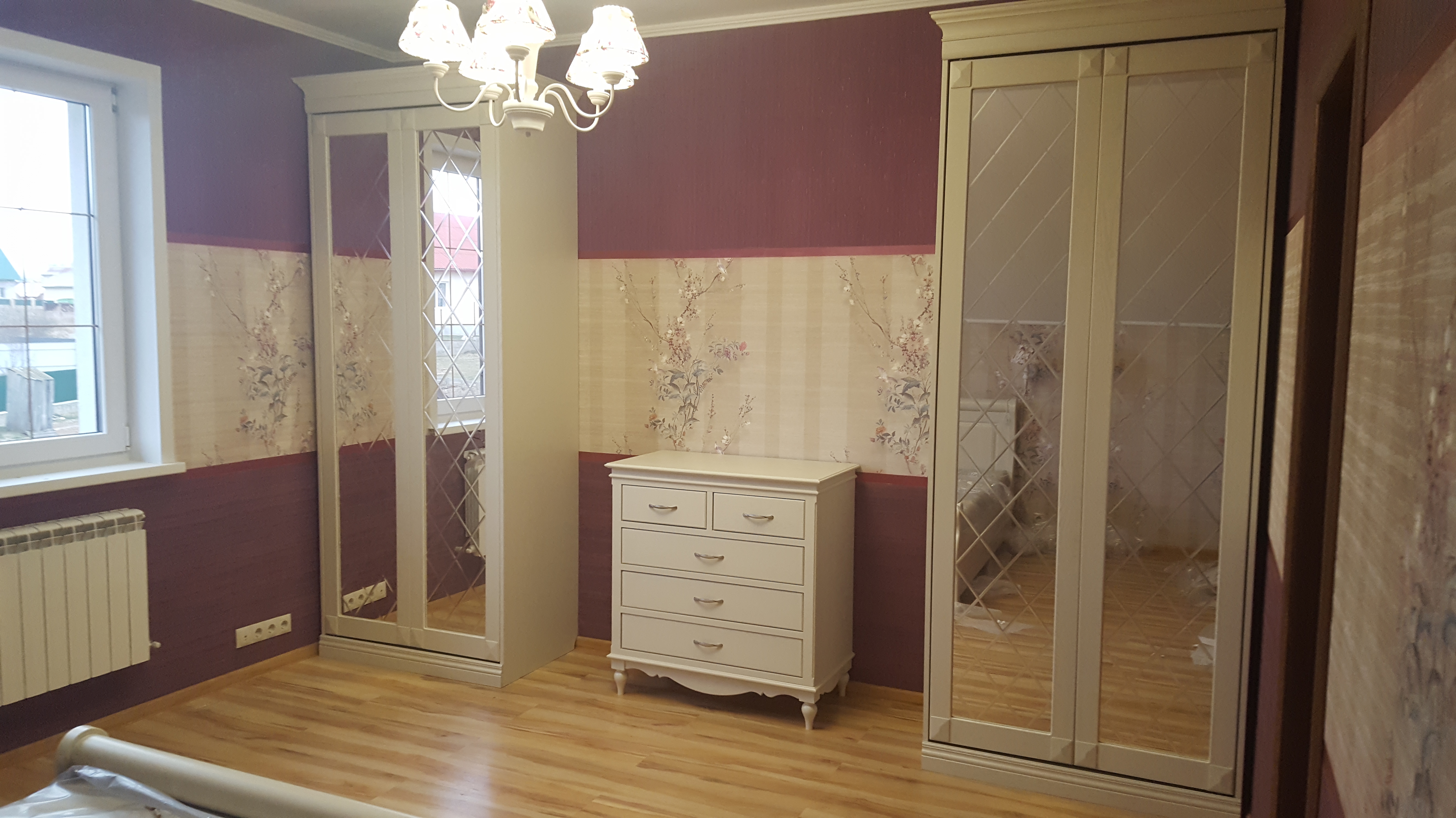 В состав набора входит удобная кровать и столик в минималистичном стиле, туалетный столик с зеркалом и полочками для различных вещей. а также просторный комод с выдвижными ящиками. Также имеются два шкафа с множеством полок и дверями с зеркальными створками.