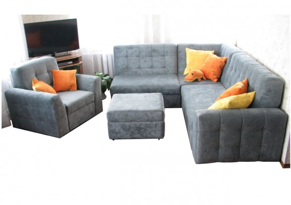 В набор входят диван-кровать, одно кресло и 2 декоративные подушки. Механизм: книга. Наполнение: пружинный блок, пенополиуретан.