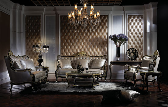Набор мягкой мебели в классическом стиле сочетается с просторным круглым журнальным столиком на невысокой опоре. Диваны и кресло обиты светлой бежевой тканью с пиковкой.