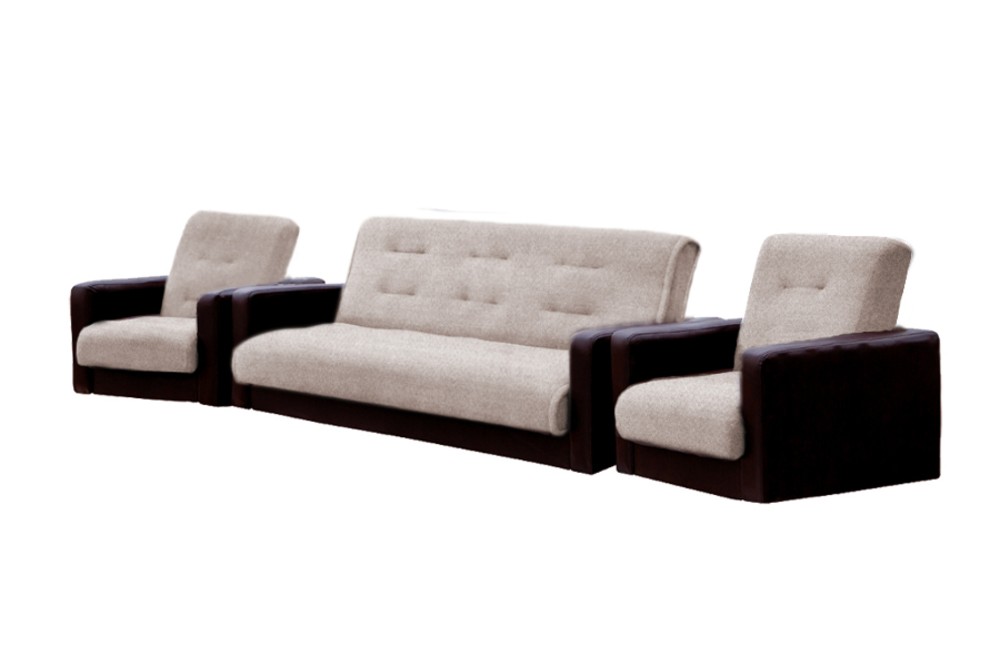 Состоит из дивана и двух кресел. Диван с ящиком для белья. Механизм: книжка.