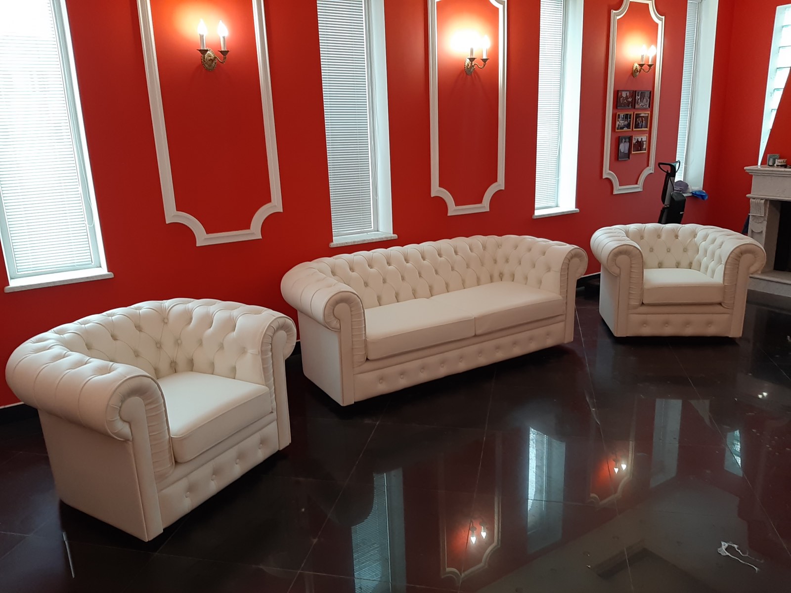 Стильный набор мебели «Честер» в белом цвете станет прекрасным дополнением для вашего интерьера. Отличительной чертой этого набора является декоративная стяжка на спинке, которая придаёт мебели изысканный вид.