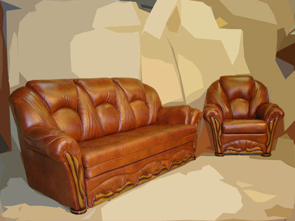 В комплектацию набора входит кресло и трехместный диван. Набор обит эко-кожей рыжего цвета.