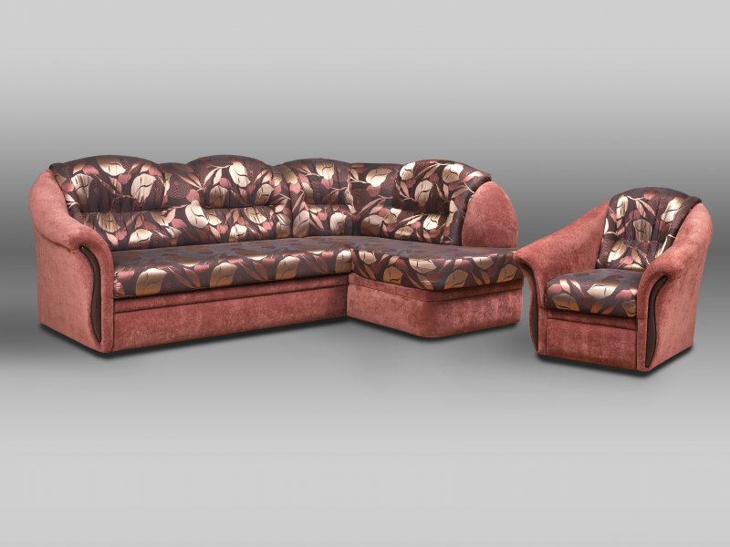 В набор входят диван-кровать, одно кресло и две декоративные подушки. Механизм: книга. Наполнение: пружинный блок, пенополиуретан.