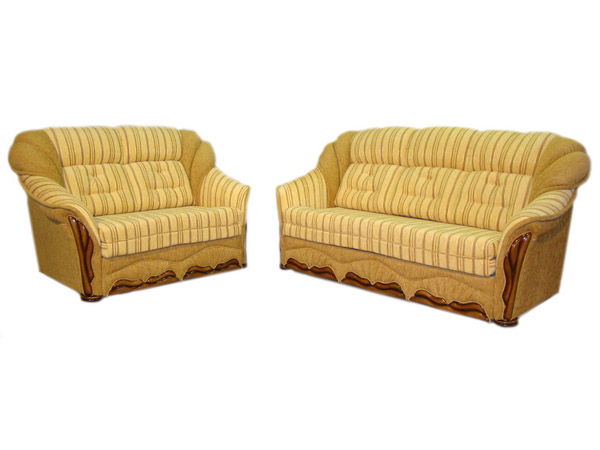 В комплектацию набора входит двух- и трехместный диван. Набор обит полосатой тканью бежевого цвета.