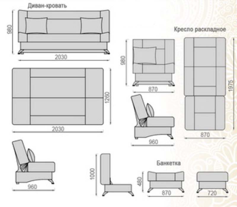 Диван-кровать: 2030х960х980 мм. Спальное место: 2030х1260 мм.