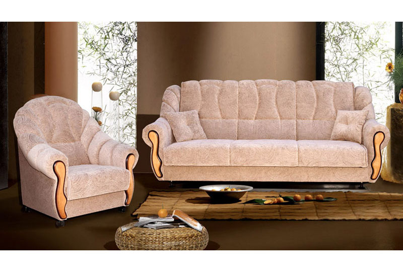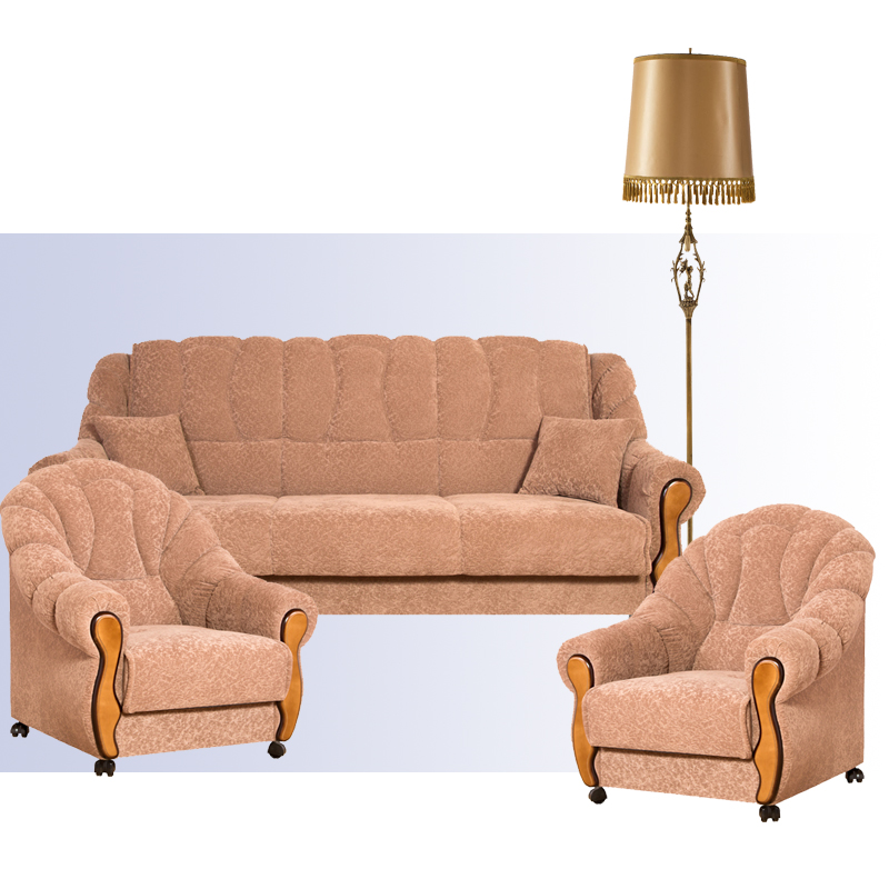 Набор «Алкександра 1» отличен от остальных моделей оригинальными резными боковинами с декоративными вставками из дерева. Наполнитель основания и спинки – пружинный блок. В комплекте две декоративные подушки. Диван трансформируется с помощью механизма «книга» в удобную кровать. Эта элегантная классическая модель рассчитана на негабаритные помещения. Может изготавливаться в разных цветовых решениях.