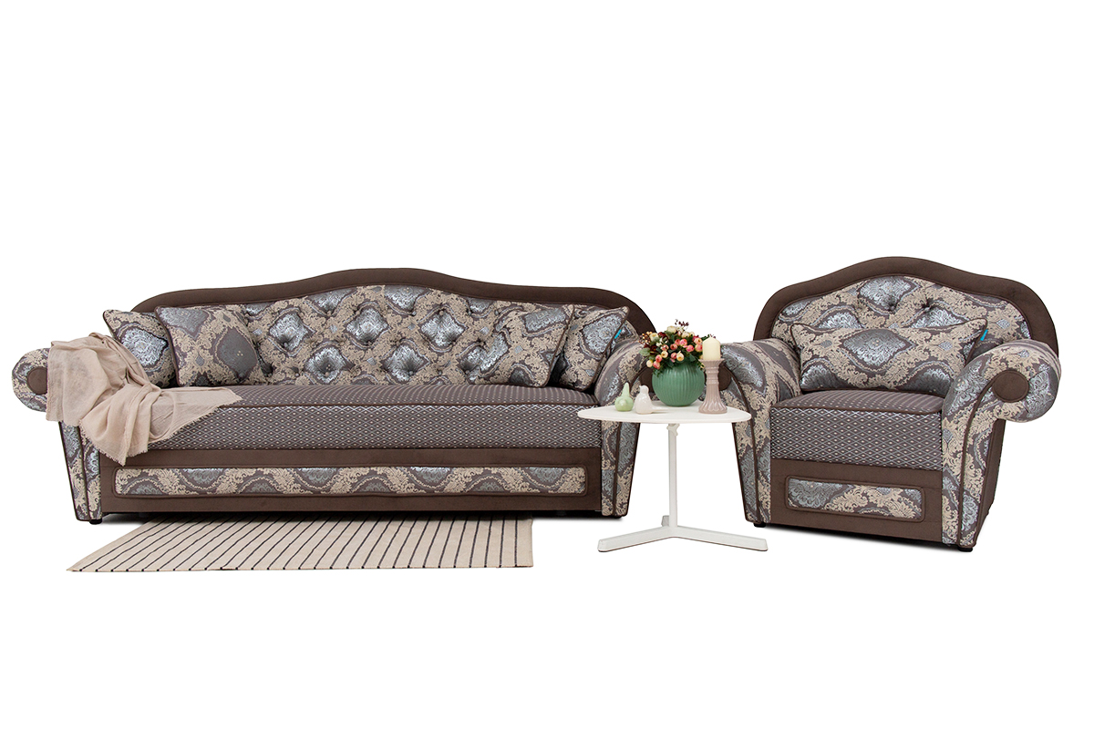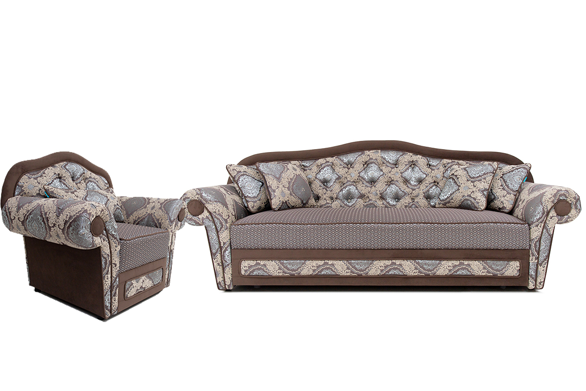 В набор входят диван-кровать, одно кресло и две декоративные подушки. Механизм: книга. Наполнение: пружинный блок, пенополиуретан.