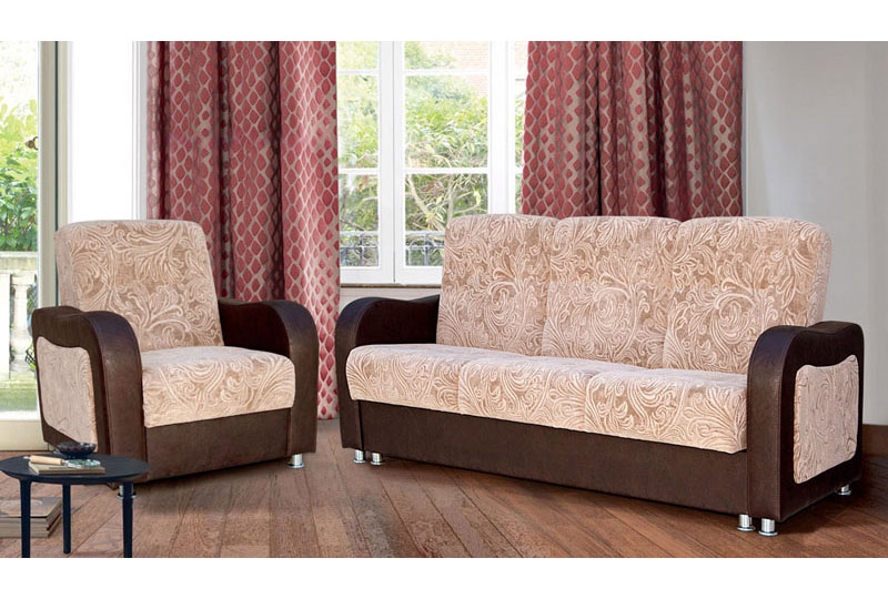 В набор входят диван-кровать, одно кресло и 2 декоративные подушки. Механизм: книга. Наполнение: пружинный блок, пенополиуретан.