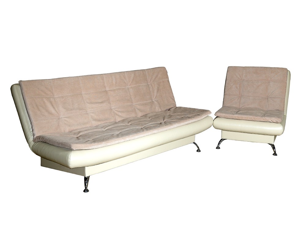 В комплект входят диван-кровать, одно кресло и 4 декоративные подушки. Механизм: пума. Наполнение: пружинный блок, пружинная змейка, пенополиуретан.