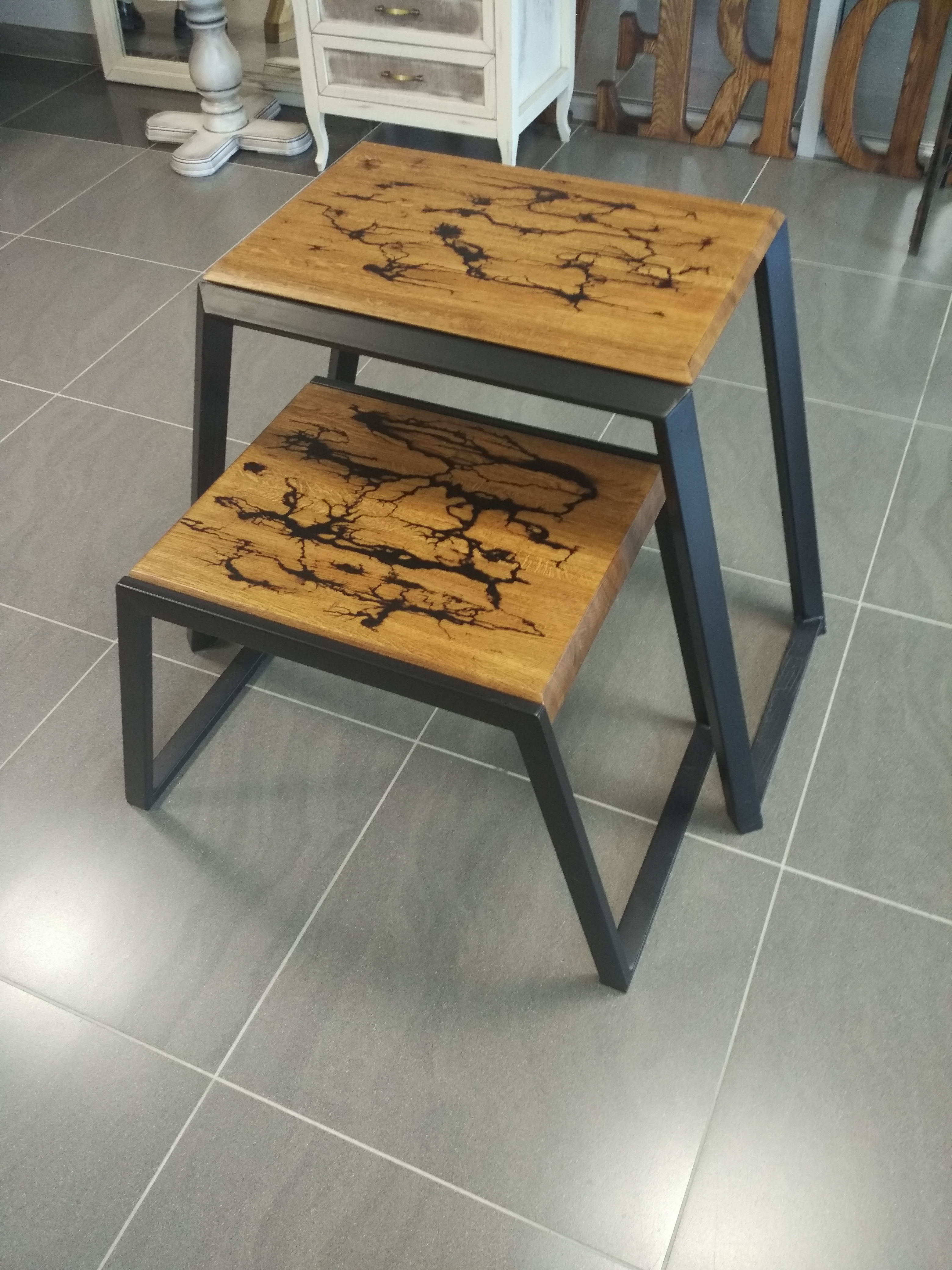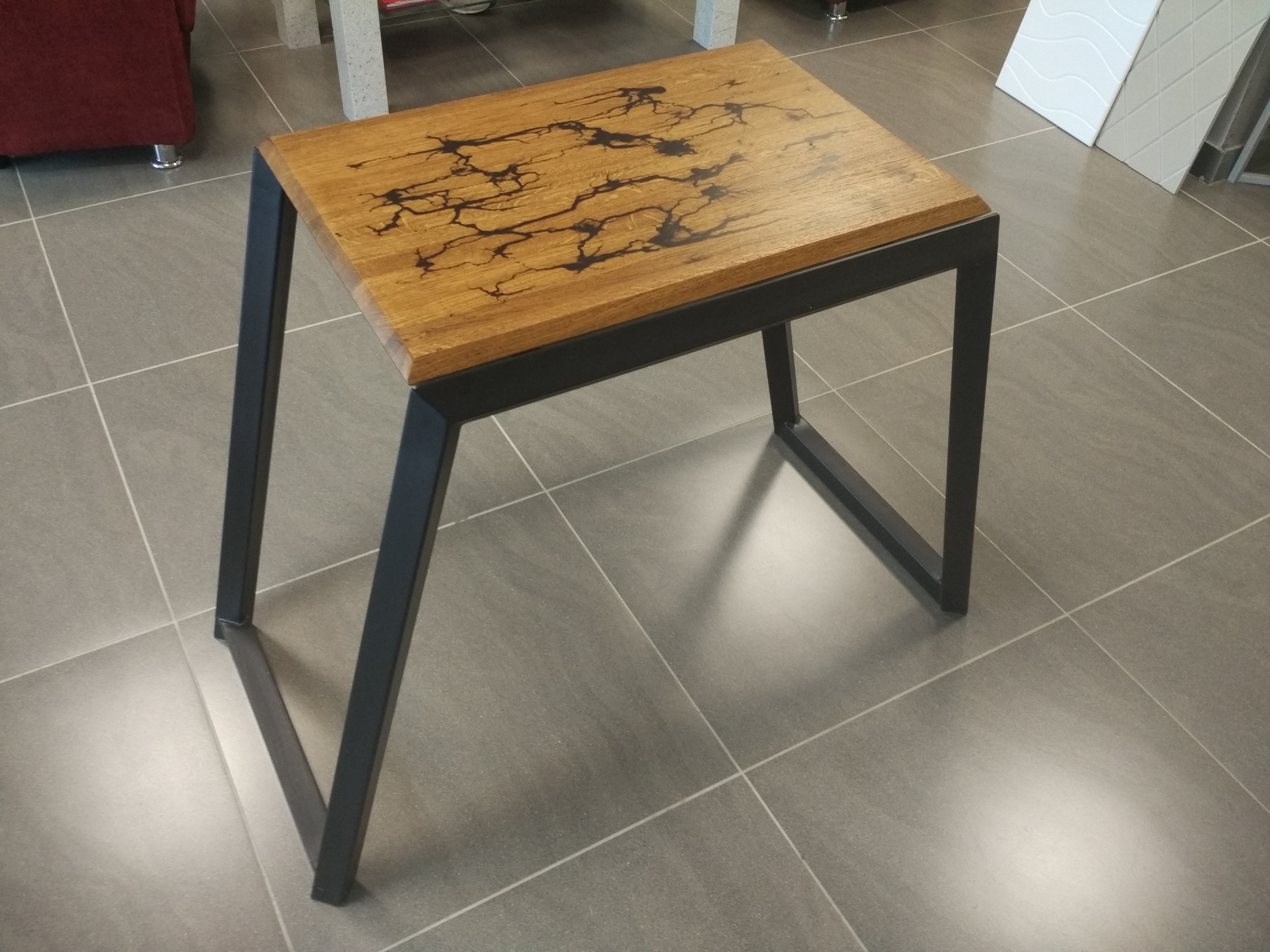 Опоры: металлическая П-образная рама с наклонными ножками. Столешница выполнена и массива дерева, лакированного и обработанного разрядом электрической дуги, создающим неповторимый древовидный вызженный узор. Набор из табурета и столика легко штабелируется, не занимая много места, подойдет для лофта, кафе или минималистичной гостиной, создавая необыкновенную атмосферу.