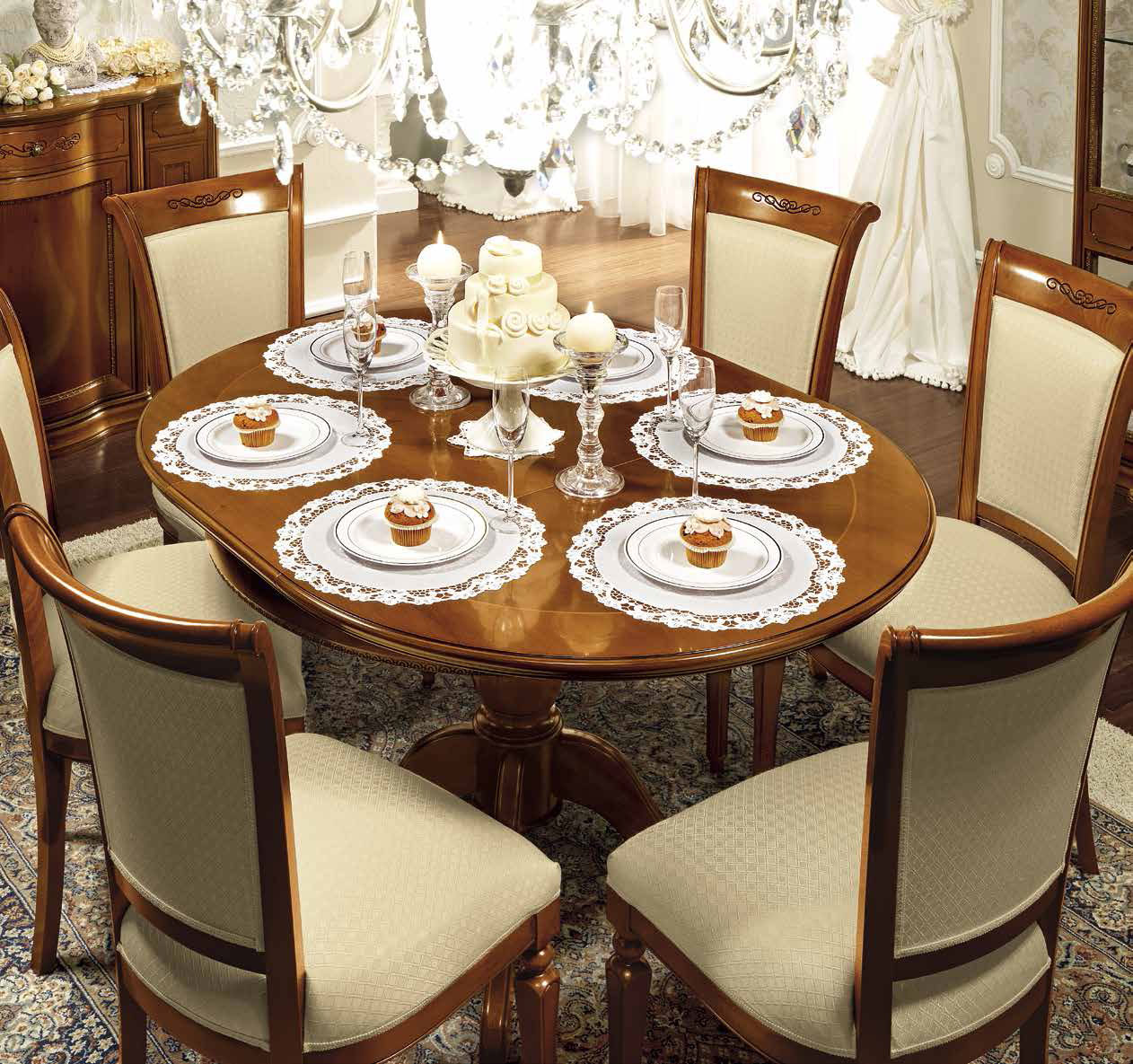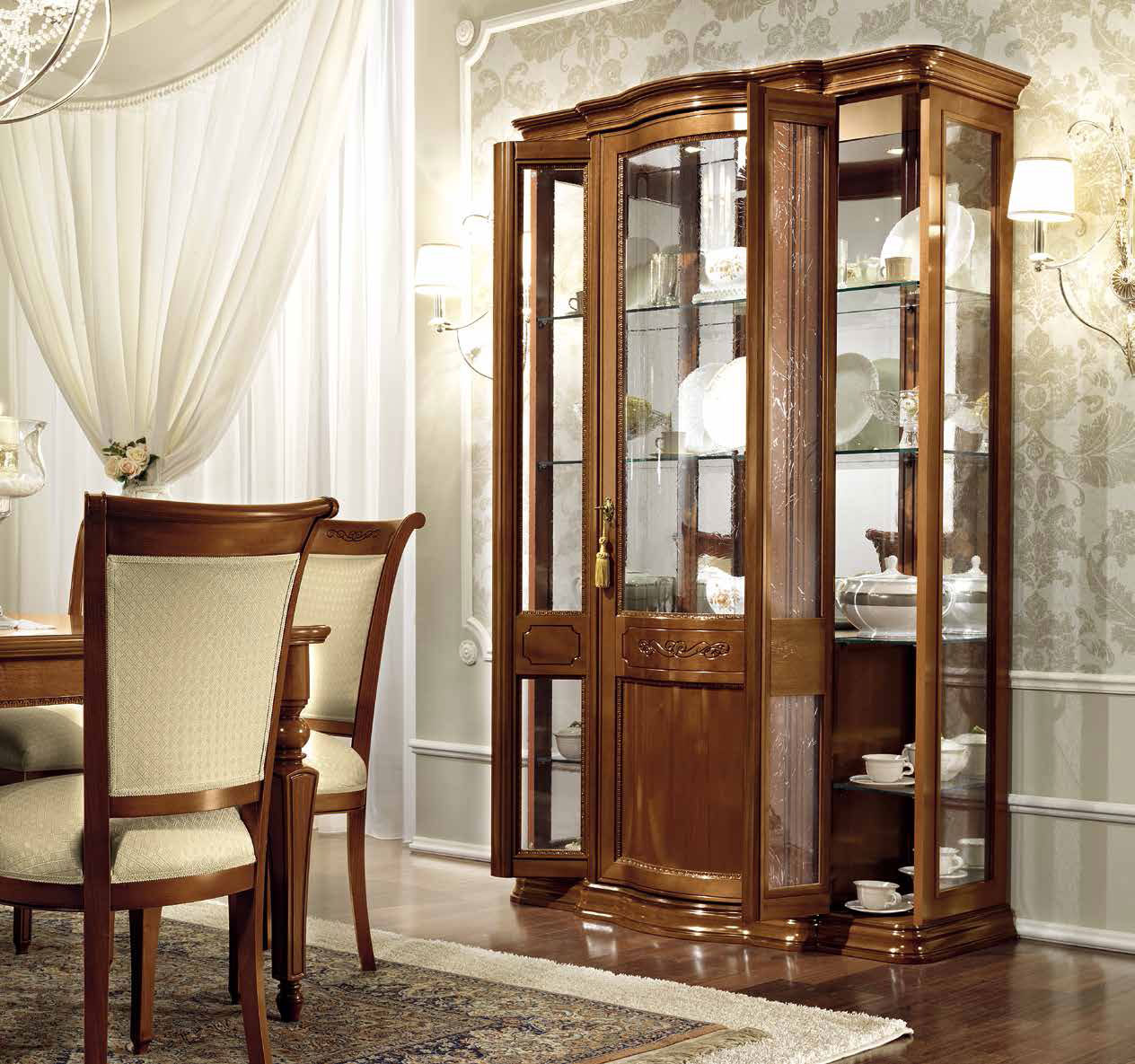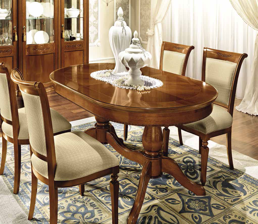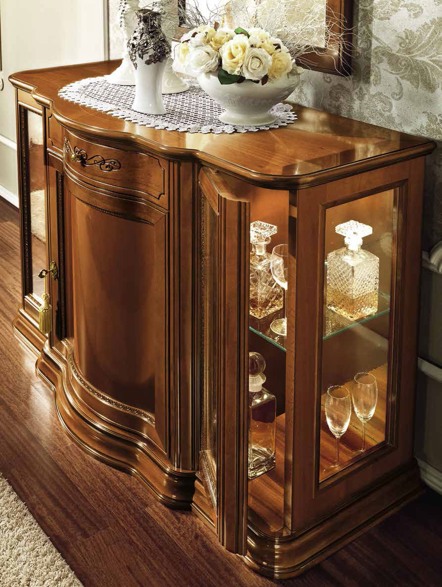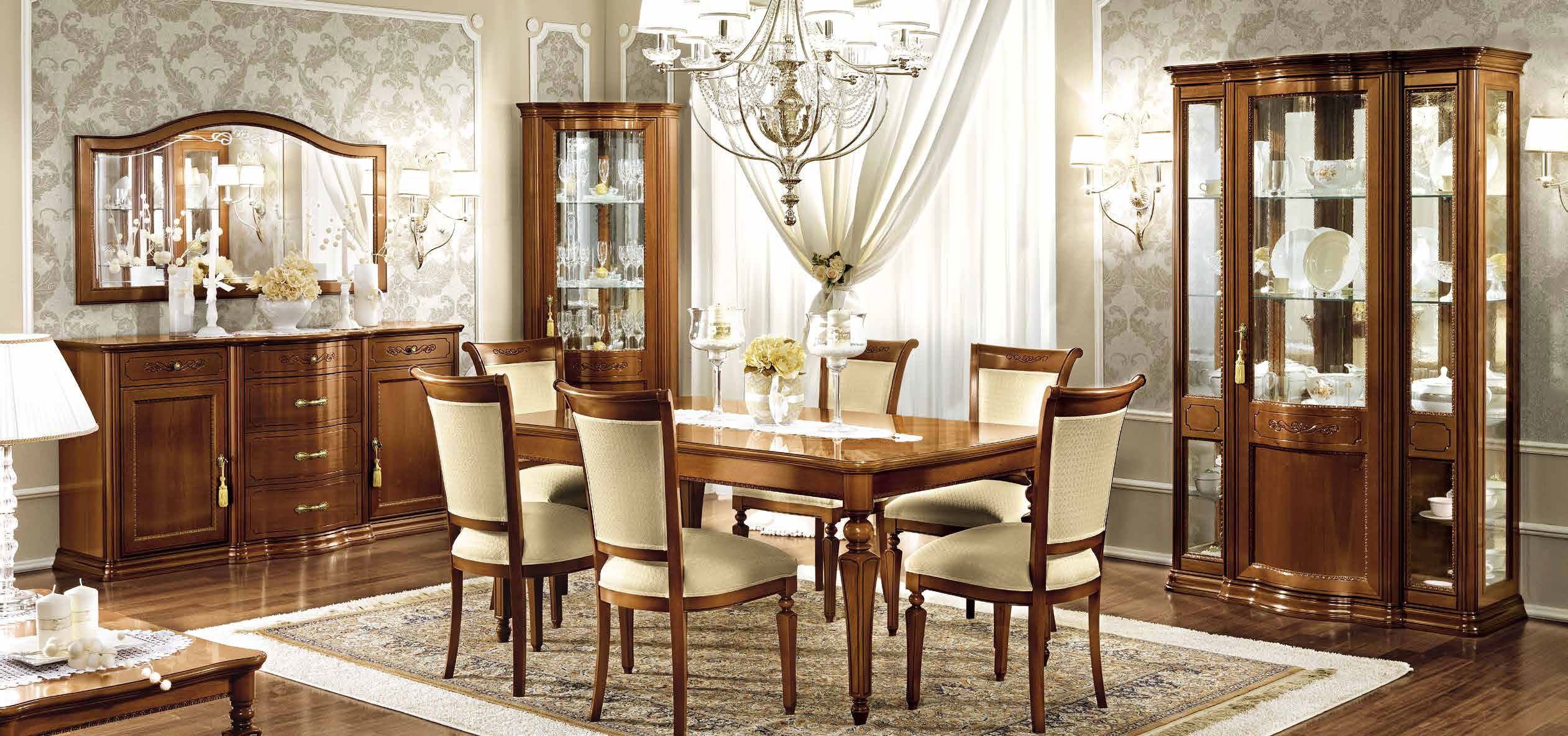 Дневная коллекция «Torriani» – это воплощение лучших итальянских форм, материалов, вкуса и креативности. Орех – особенный вид дерева, используемый итальянскими краснодеревщиками в производстве мебели. Панели коллекции «Torriani» покрыты шпоном ореха, который отличается устойчивостью к царапинам и ударам, а так же обогащает мебель элегантными муаровыми мотивами. Итальянский классический вкус, с его мягкими и изящными линиями, сделанными инкрустациями клена и резными рамами, достиг преимущества в этой дневной коллекции. Массив дерева и шпон ореха. Декоративная резьба.