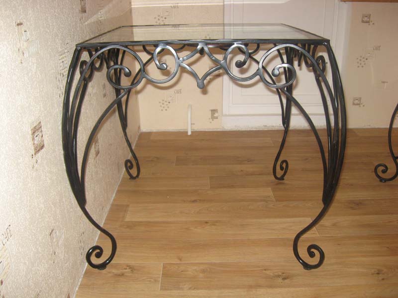 Обеденная группа из кованого металла отличается благородным видом и долговечностью в эксплуатации. Стол имеет квадратную форму столешницы, сама же столешница изготовлена из прозрачного стекла. Все элементы обеденной группы выделяются витиеватыми коваными вставками.