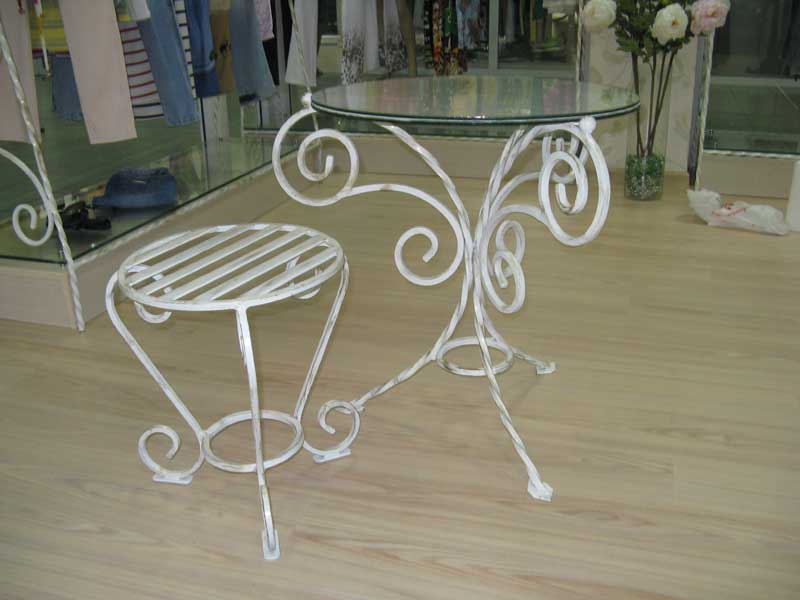 Набор включает два элемента: кованый табурет и стол со столешницей круглой формы. Кованый каркас выполнен в белом цвете. Столешница стола изготовлена из прозрачного стекла.