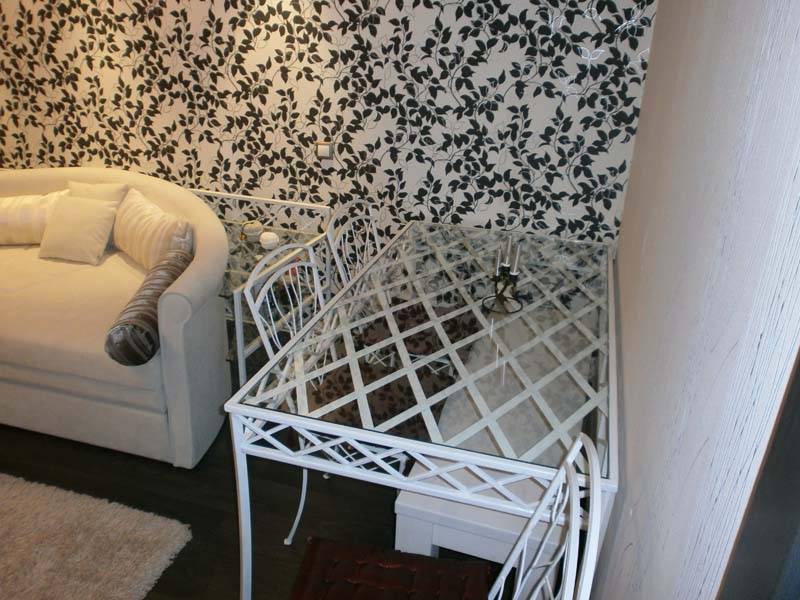 Кованая обеденная группа белого цвета со стеклянной столешницей