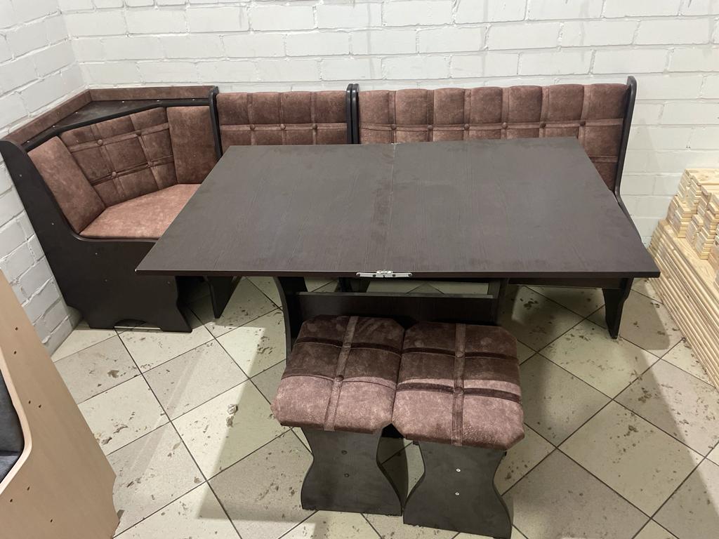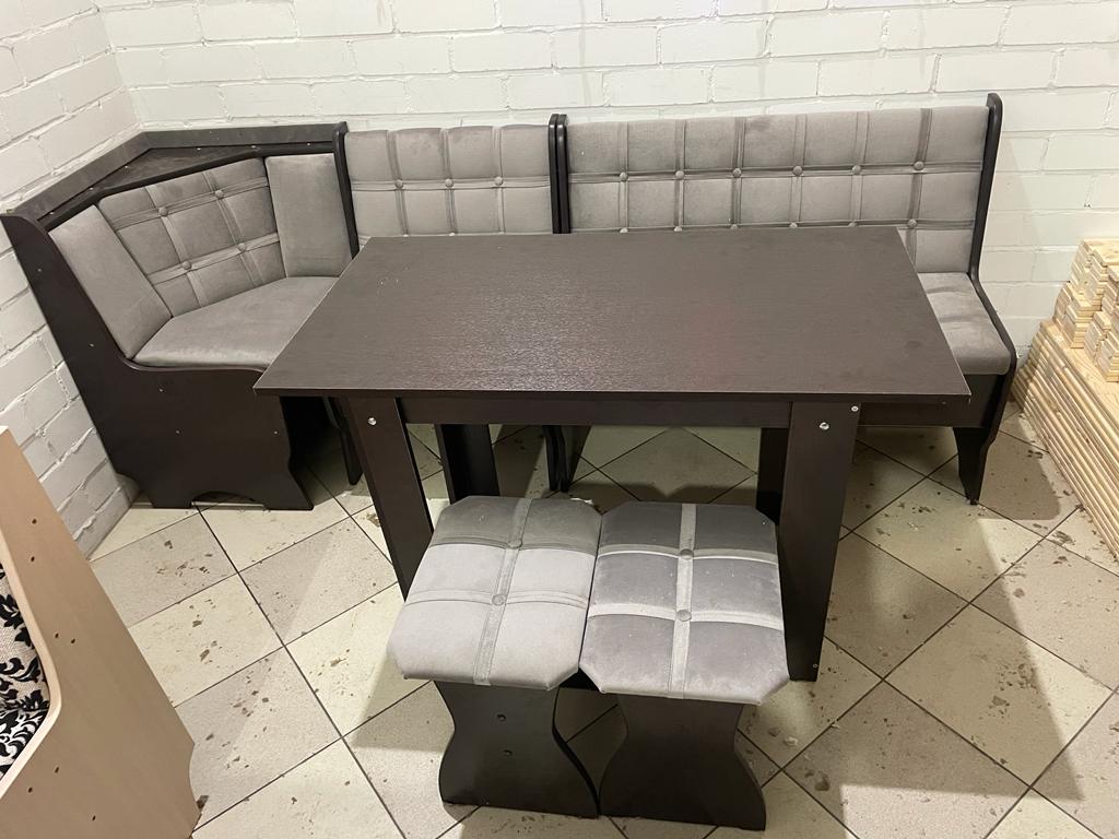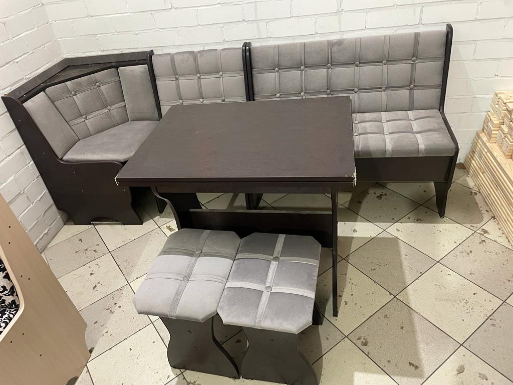 В набор входит угловая скамья, стол и два табурета. Цвет и размер на выбор.