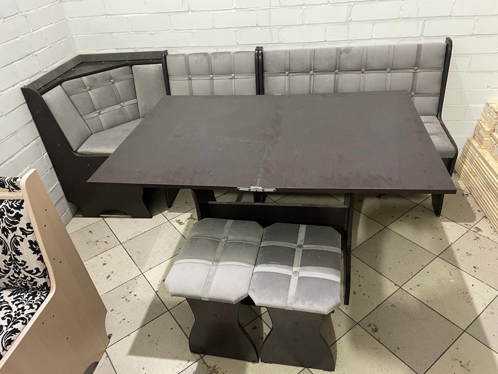 Состоит из углового кухонного дивана, обеденного стола и двух мягких табуретов. Под сиденьем находятся ящики для хранения. Универсальная сборка - право/лево.