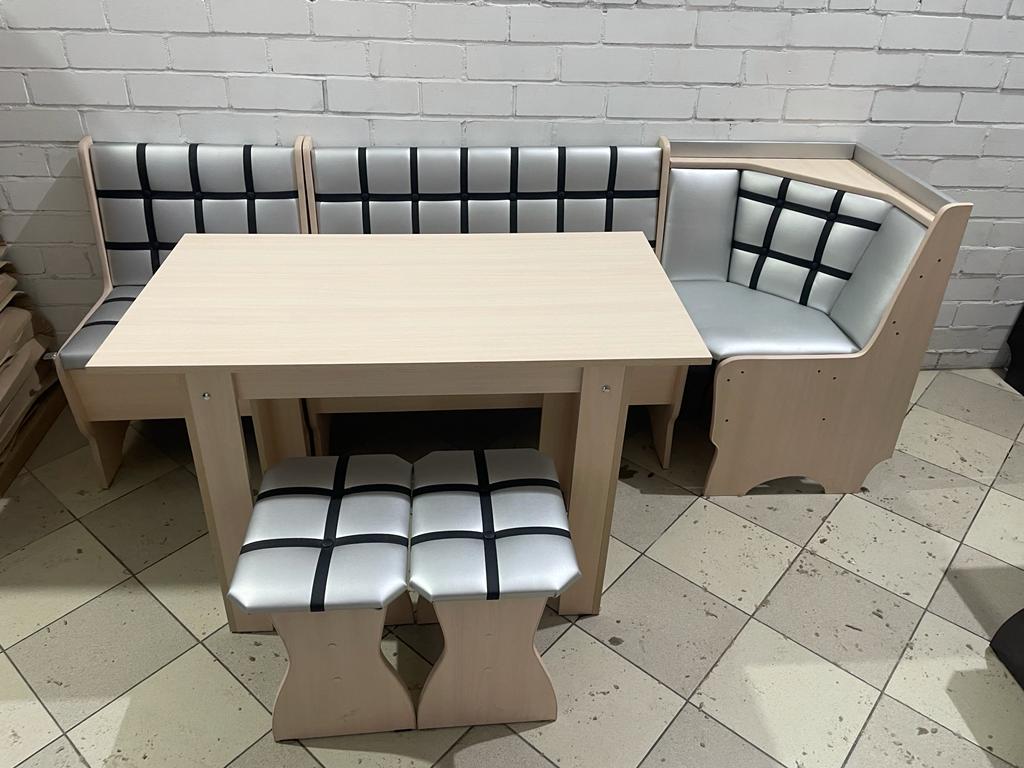 В набор входит угловая скамья, стол и два табурета. Цвет и размер на выбор.