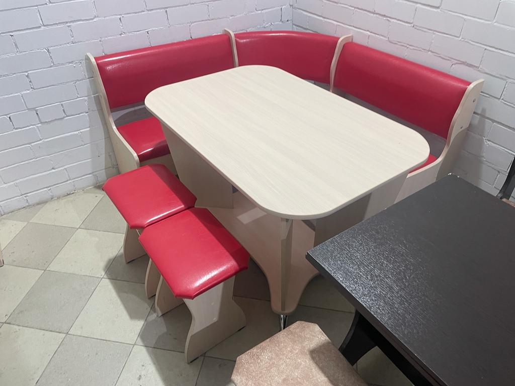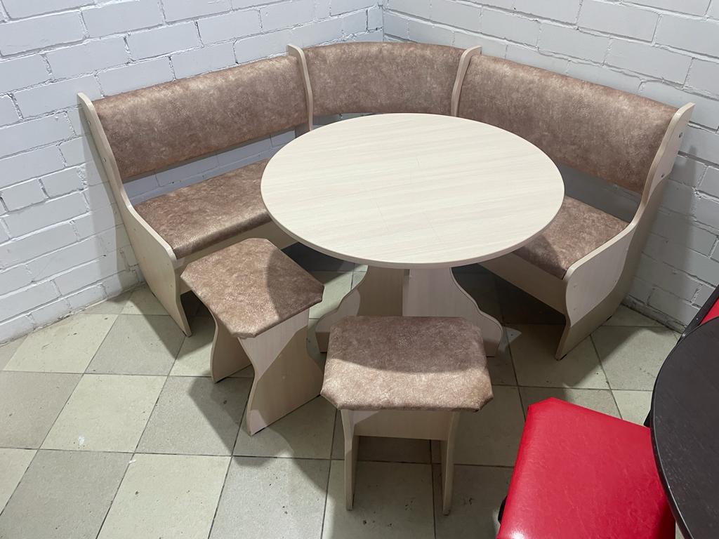 В набор входит угловая скамья, стол и два табурета. Цвет и размер на выбор.
