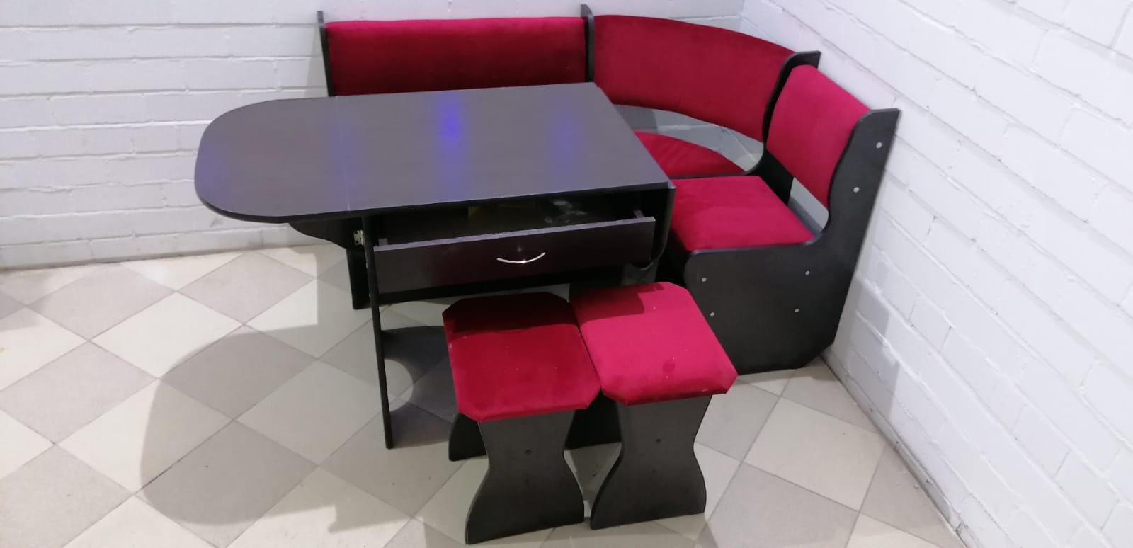 В набор входит угловая скамья, стол и два табурета. Цвет и размер на выбор.