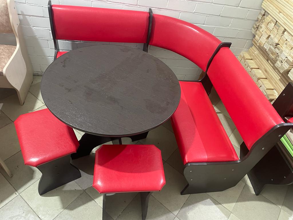 В набор входит угловая скамья, стол и два табурета. Цвет и размер на выбор.