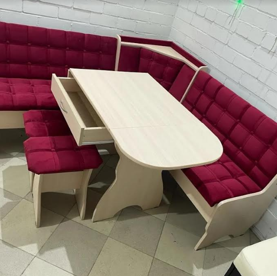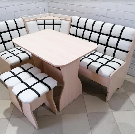 В набор входит угловая скамья, стол и два табурета. Цвет и размер на выбор.