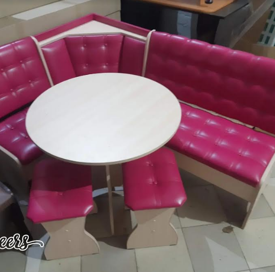 Кухонный уголок с глянцевой обивкой. В набор входит: угловая скамья, стол, два табурета. Обивка: экокожа, ткань.