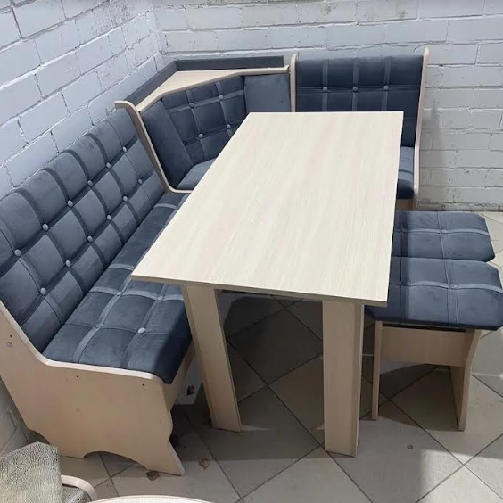 Состоит из углового кухонного дивана, обеденного стола и двух мягких табуретов. Под сиденьем находятся ящики для хранения. Универсальная сборка - право/лево.