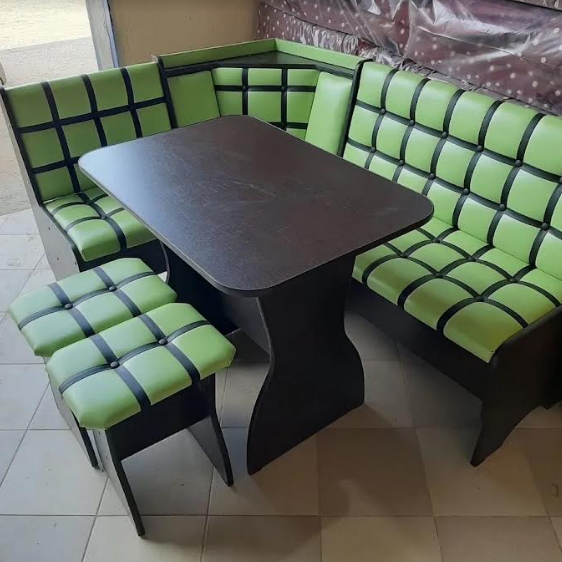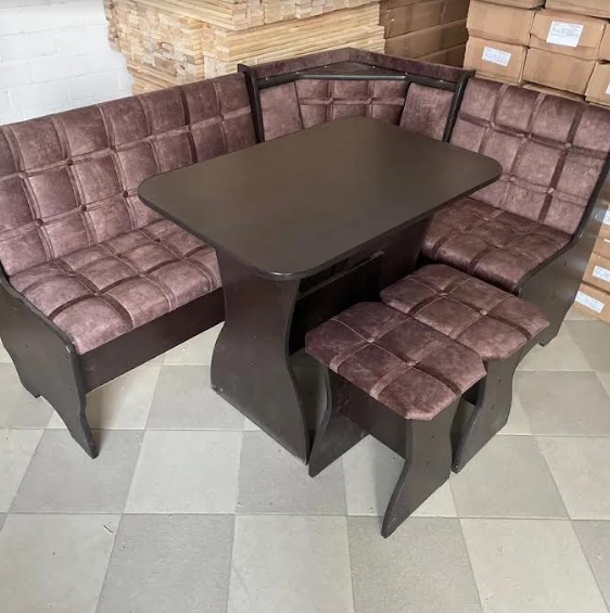 В набор входит: угловая скамья, стол, два табурета. Обивка: экокожа, ткань
