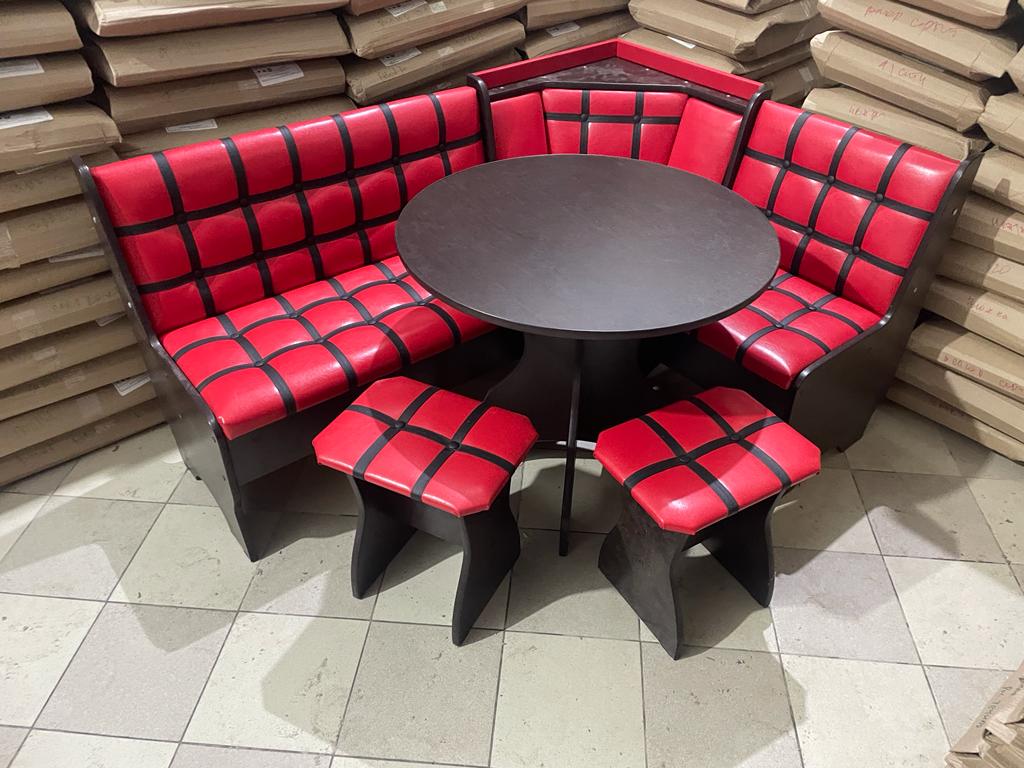 В набор входит: угловая скамья, стол, два табурета. Обивка: экокожа, ткань