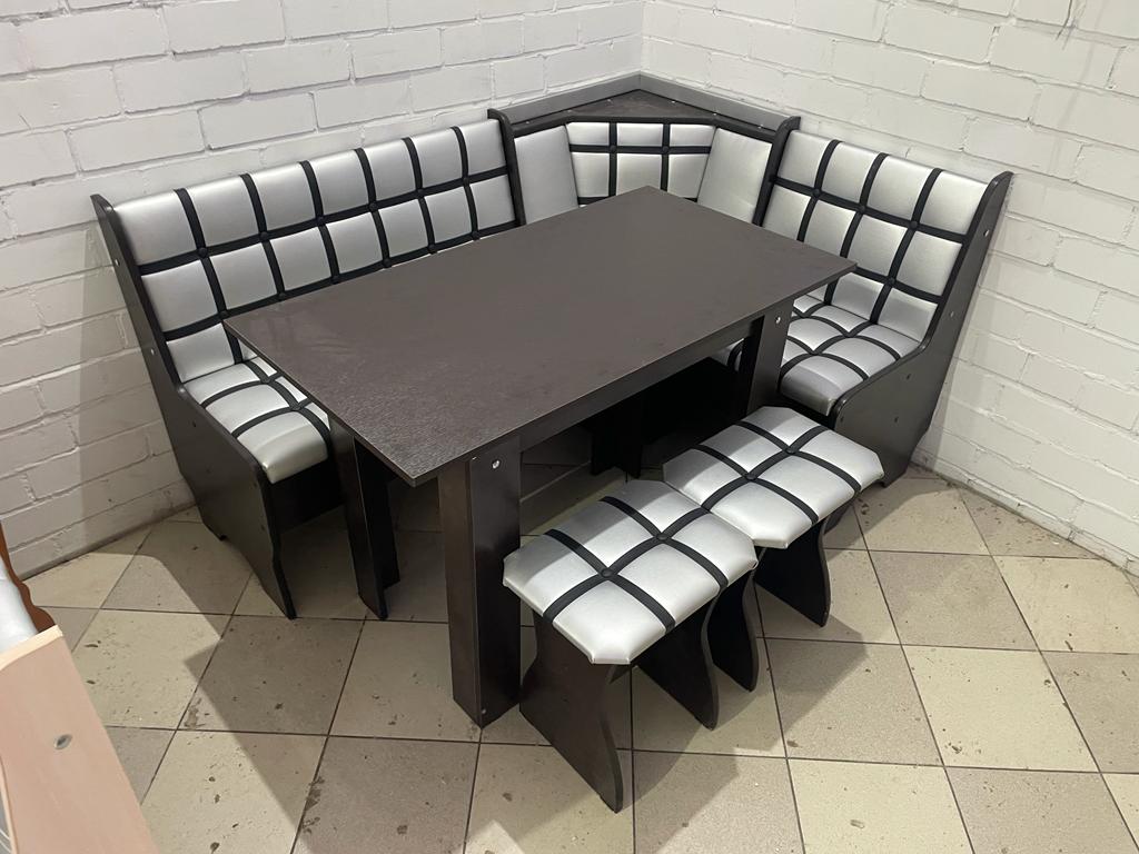 В набор входит угловая скамья, стол и два табурета. Цвет и размер на выбор.