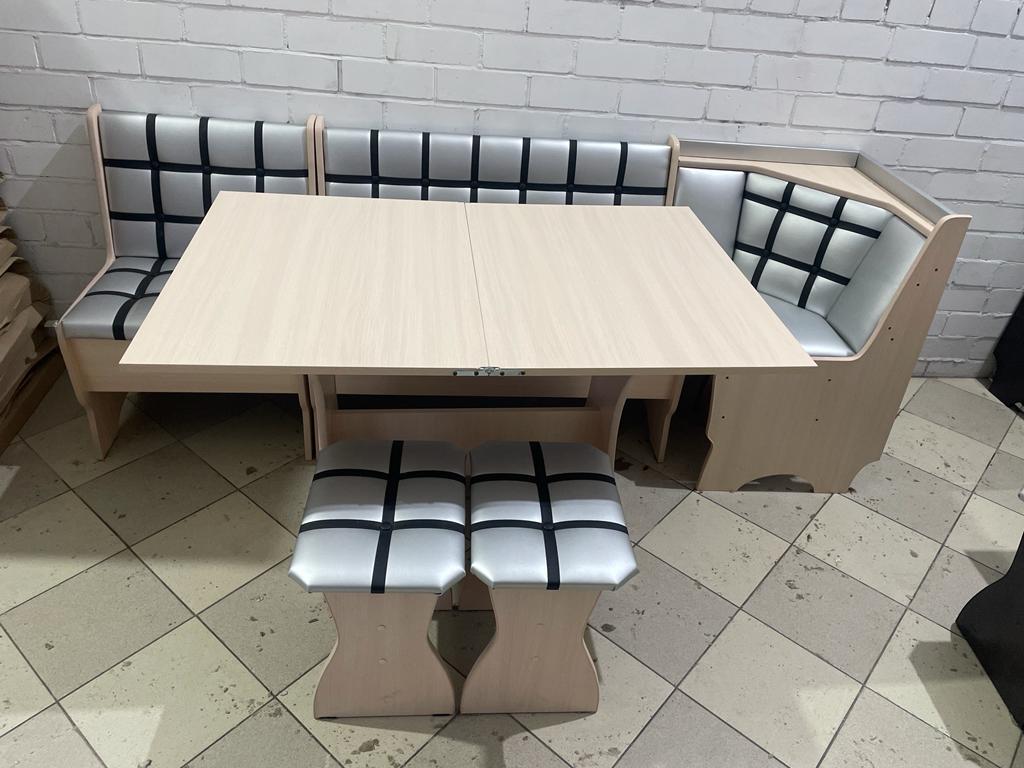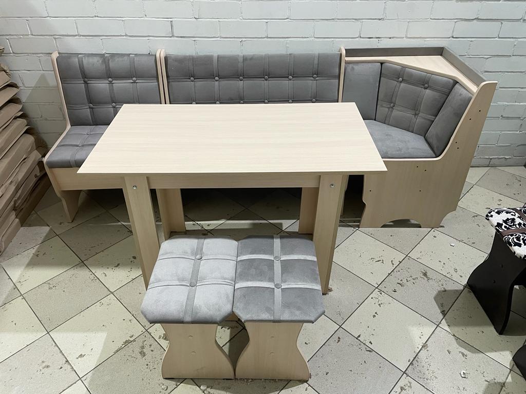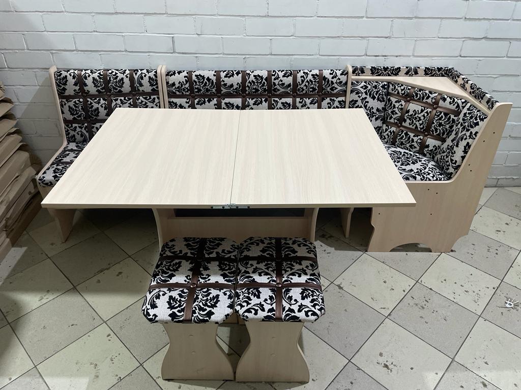В набор входит угловая скамья, стол и два табурета. Цвет и размер на выбор.