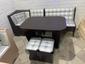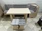 Состоит из углового кухонного дивана, обеденного стола и двух мягких табуретов. Под сиденьем находятся ящики для хранения. Универсальная сборка - право/лево.