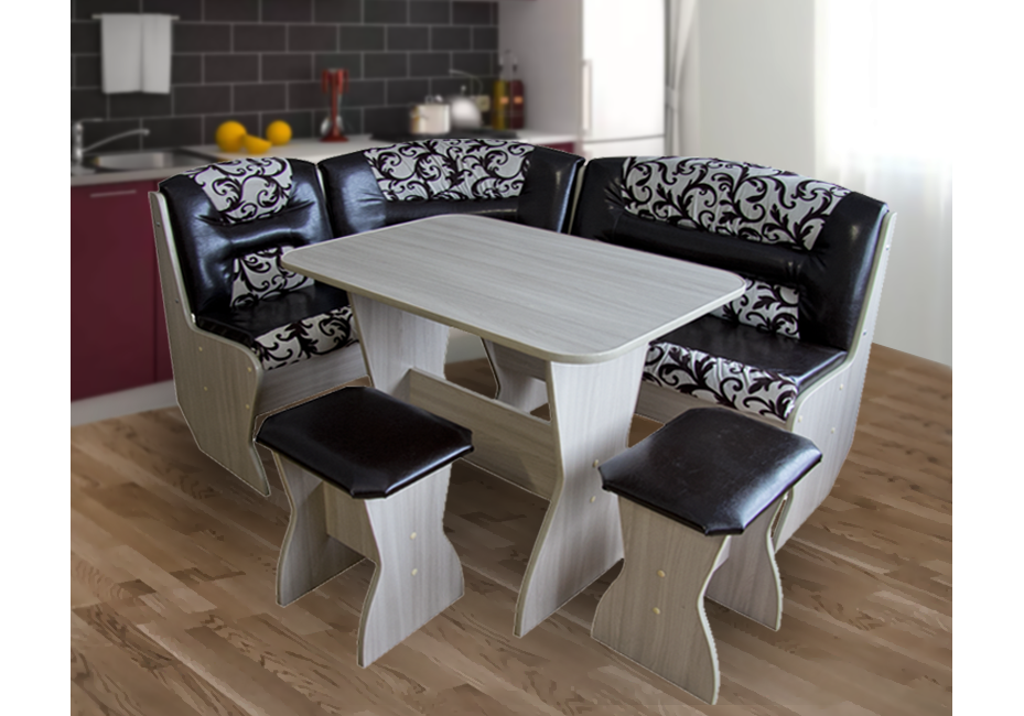 код 106254Стильный и современный набор для кухни. В набор входит угловой диван, стол и два табурета.