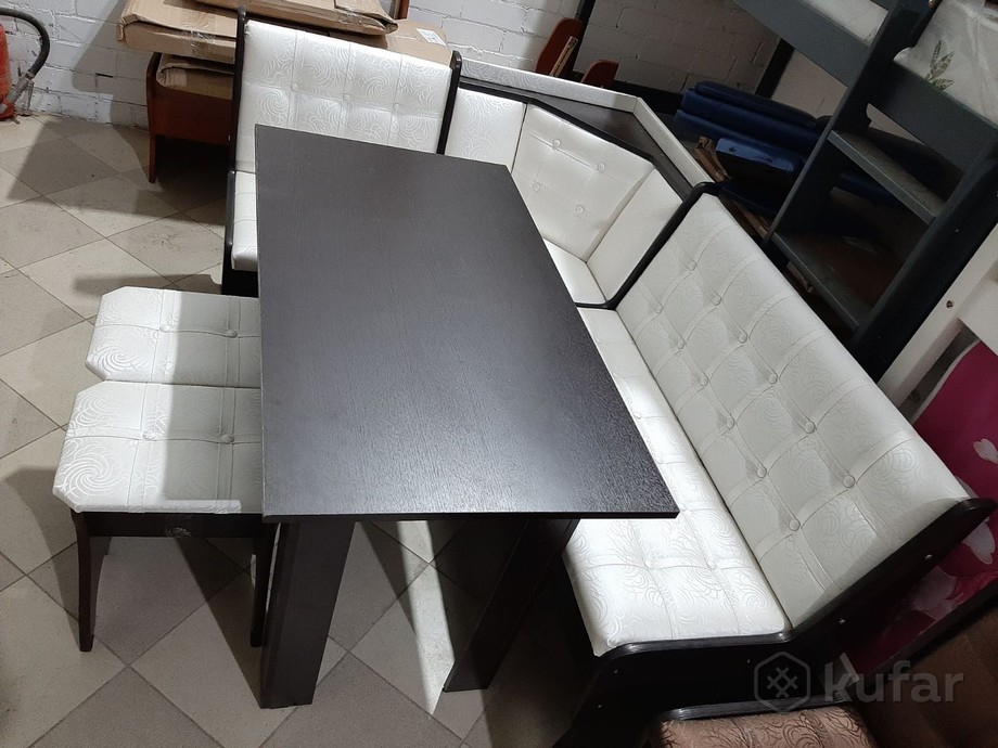 код 105259Современный набор для кухни с угловой скамьей, столом и двумя табуретами.