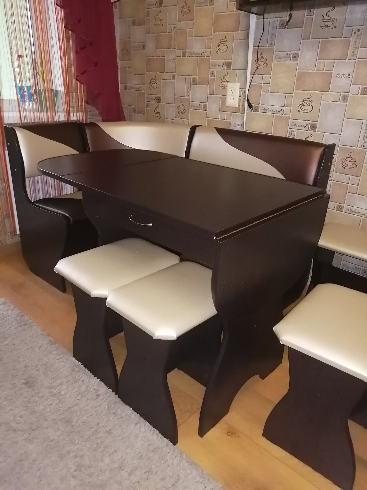 В набор входит угловая скамья, стол и два табурета. Цвет и размер на выбор.