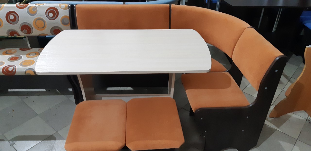 В набор входит угловая скамья, стол и два табурета. Цвет и размер на выбор.
