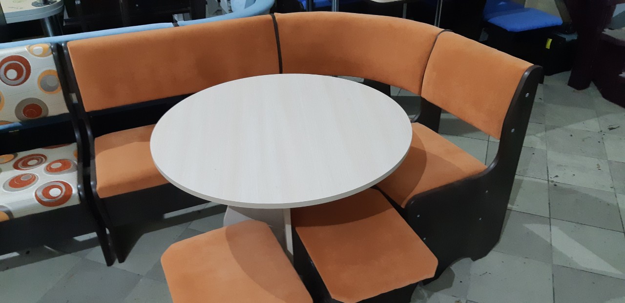 В набор входит угловая скамья, стол и два табурета. Множество вариантов цветов.