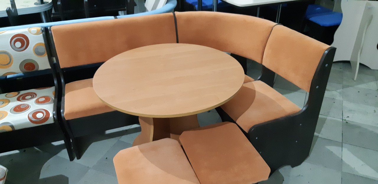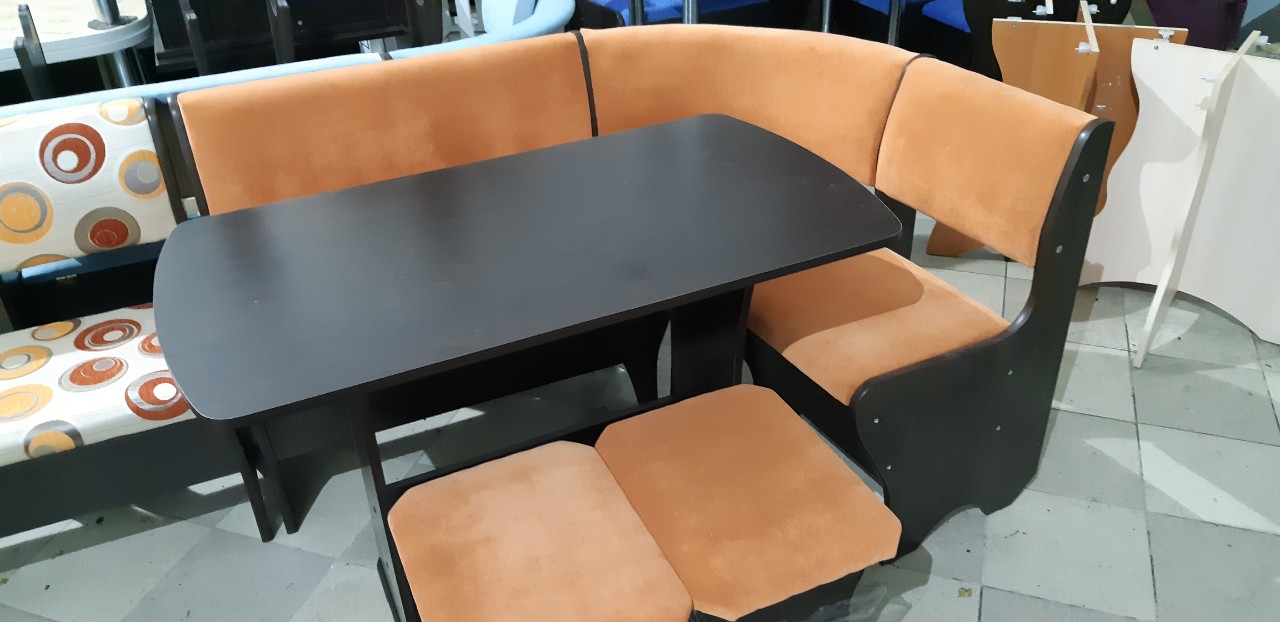 Состоит из углового кухонного дивана, обеденного стола и двух мягких табуретов. Под сиденьем находятся ящики для хранения. Универсальная сборка - право/лево.