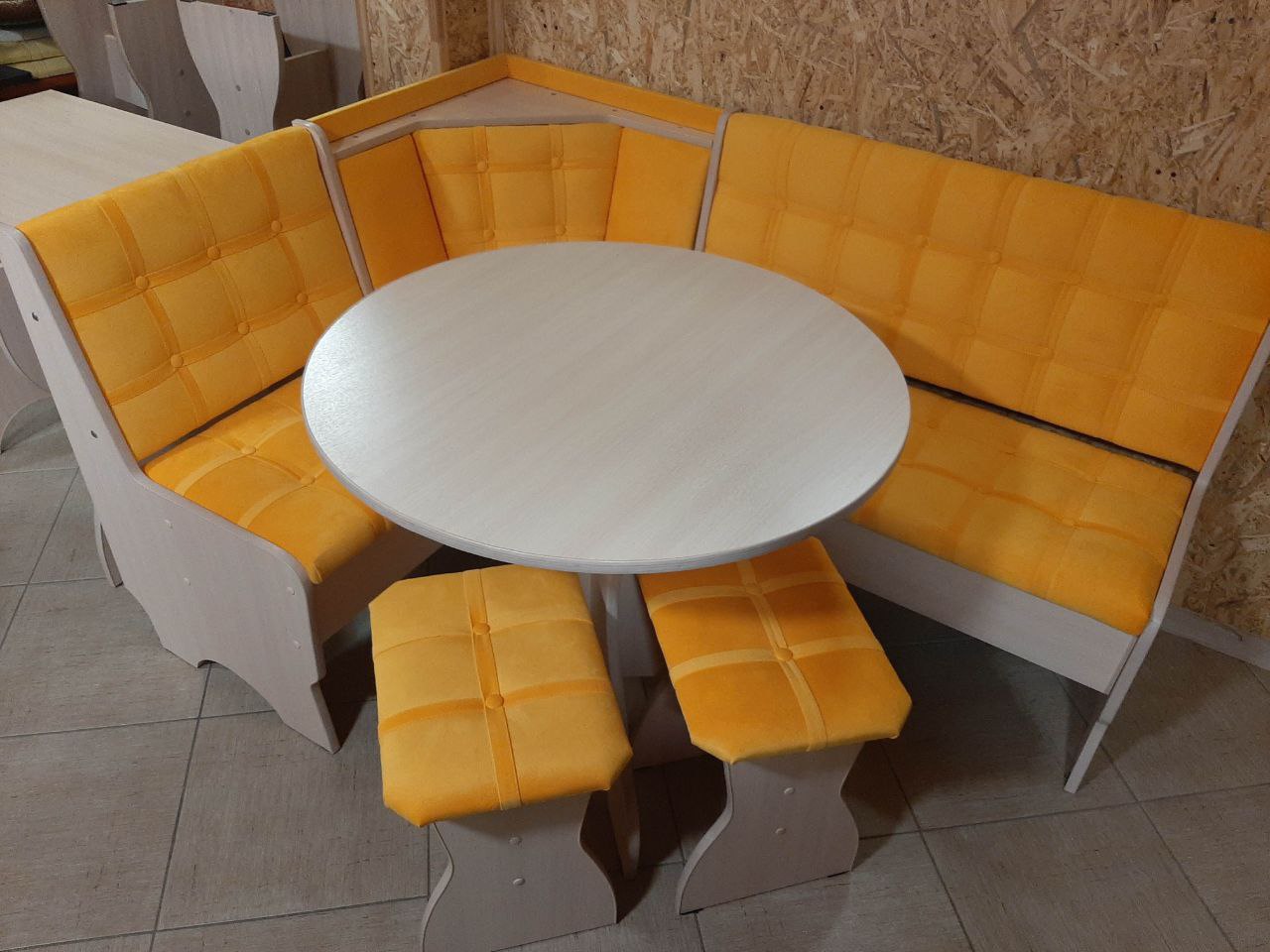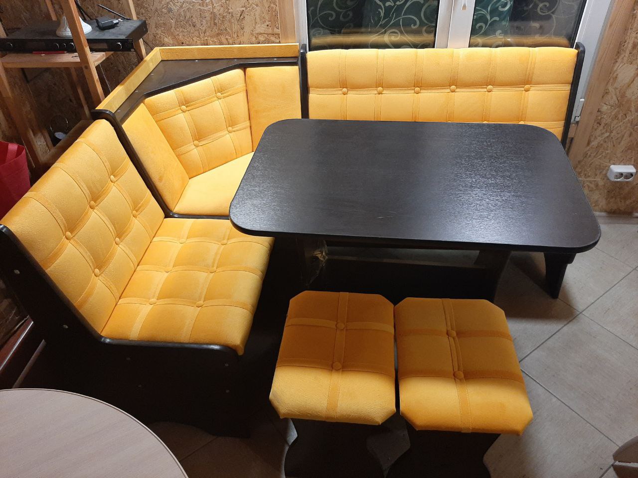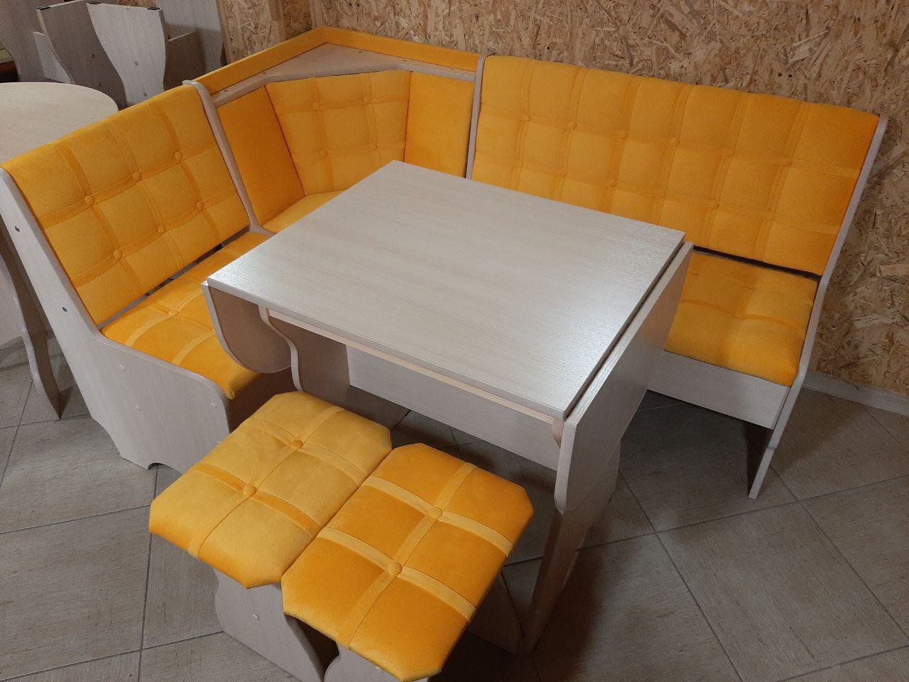В набор входит угловая скамья, стол и два табурета. Цвет и размер на выбор.