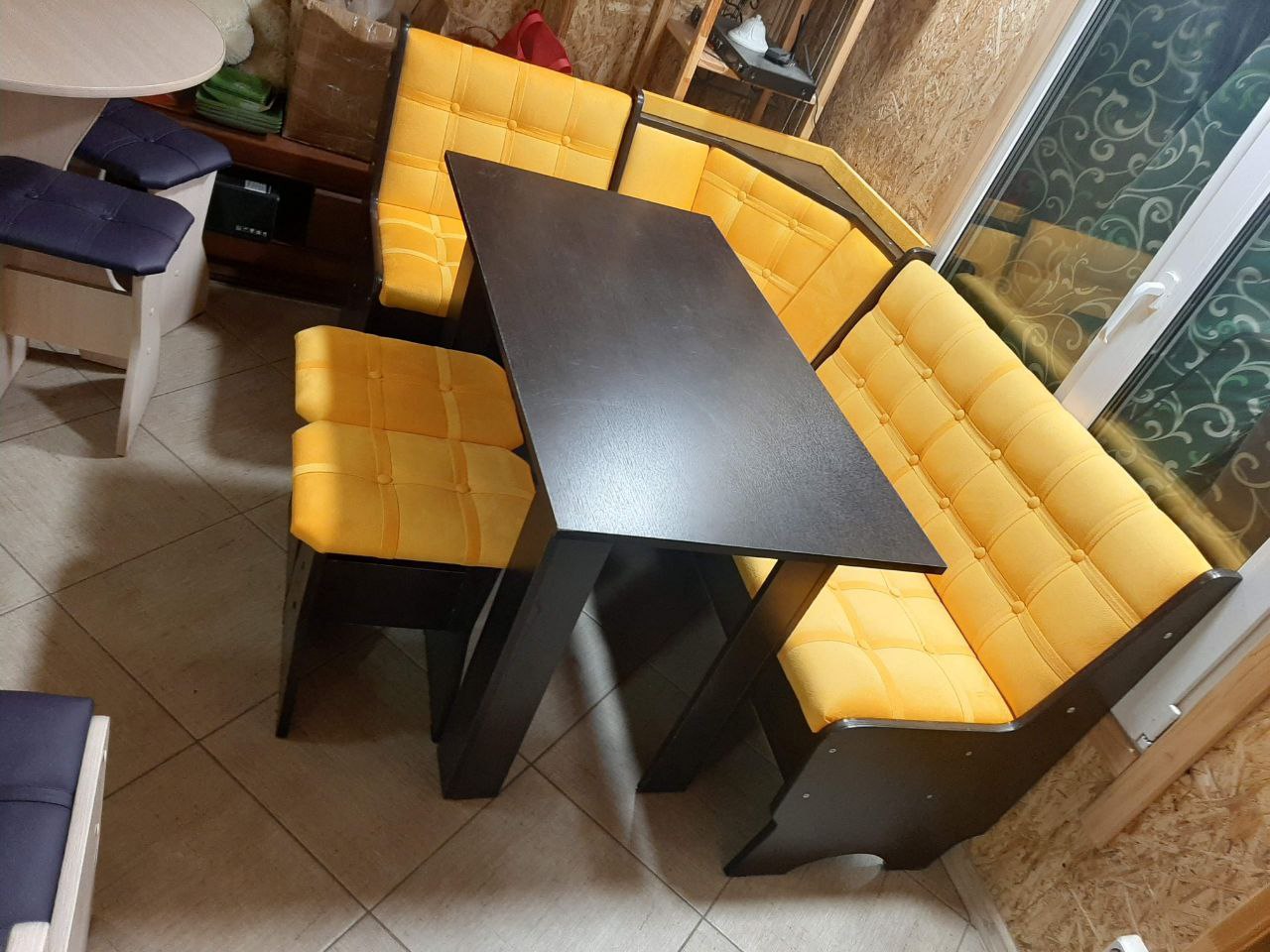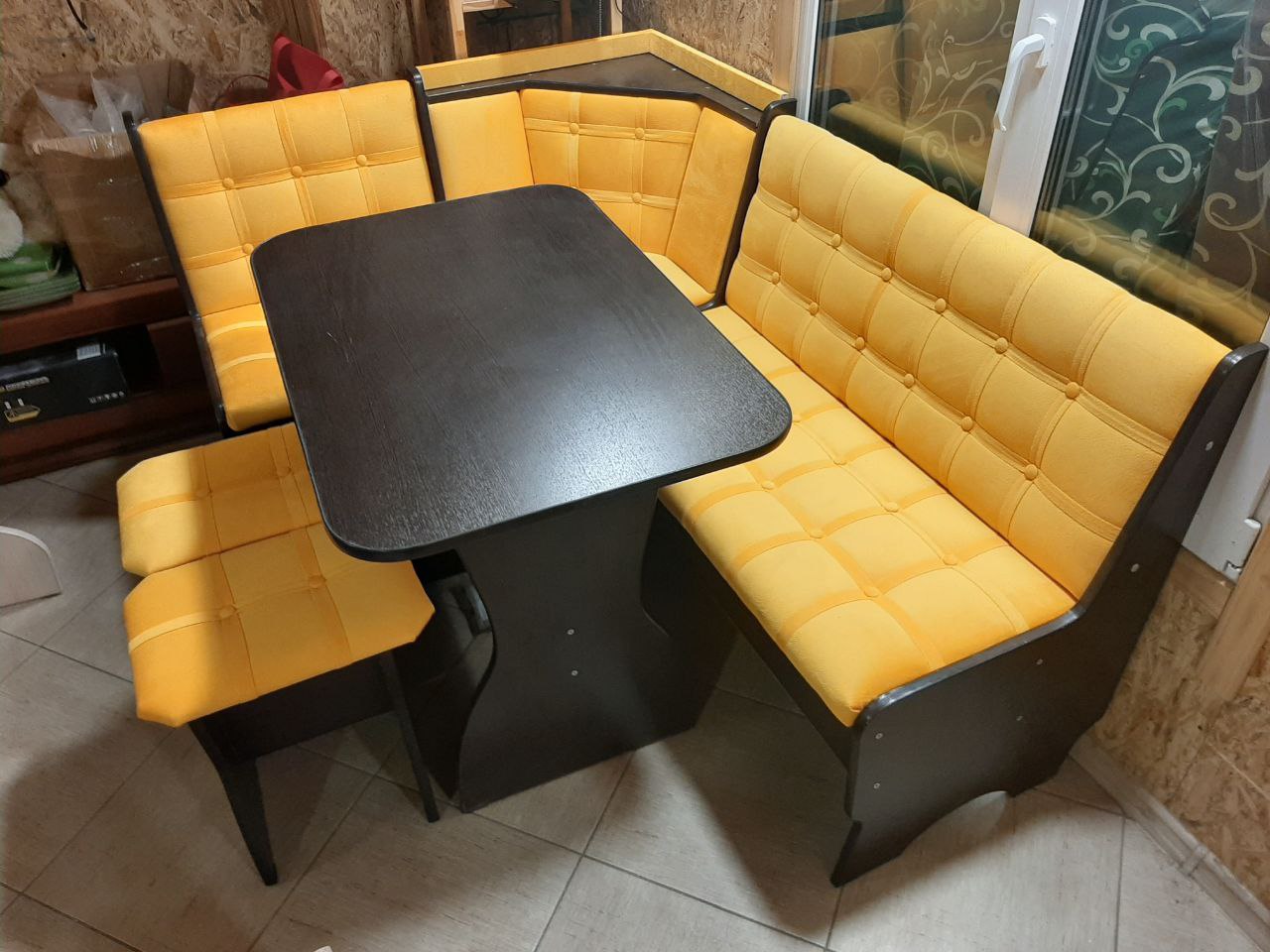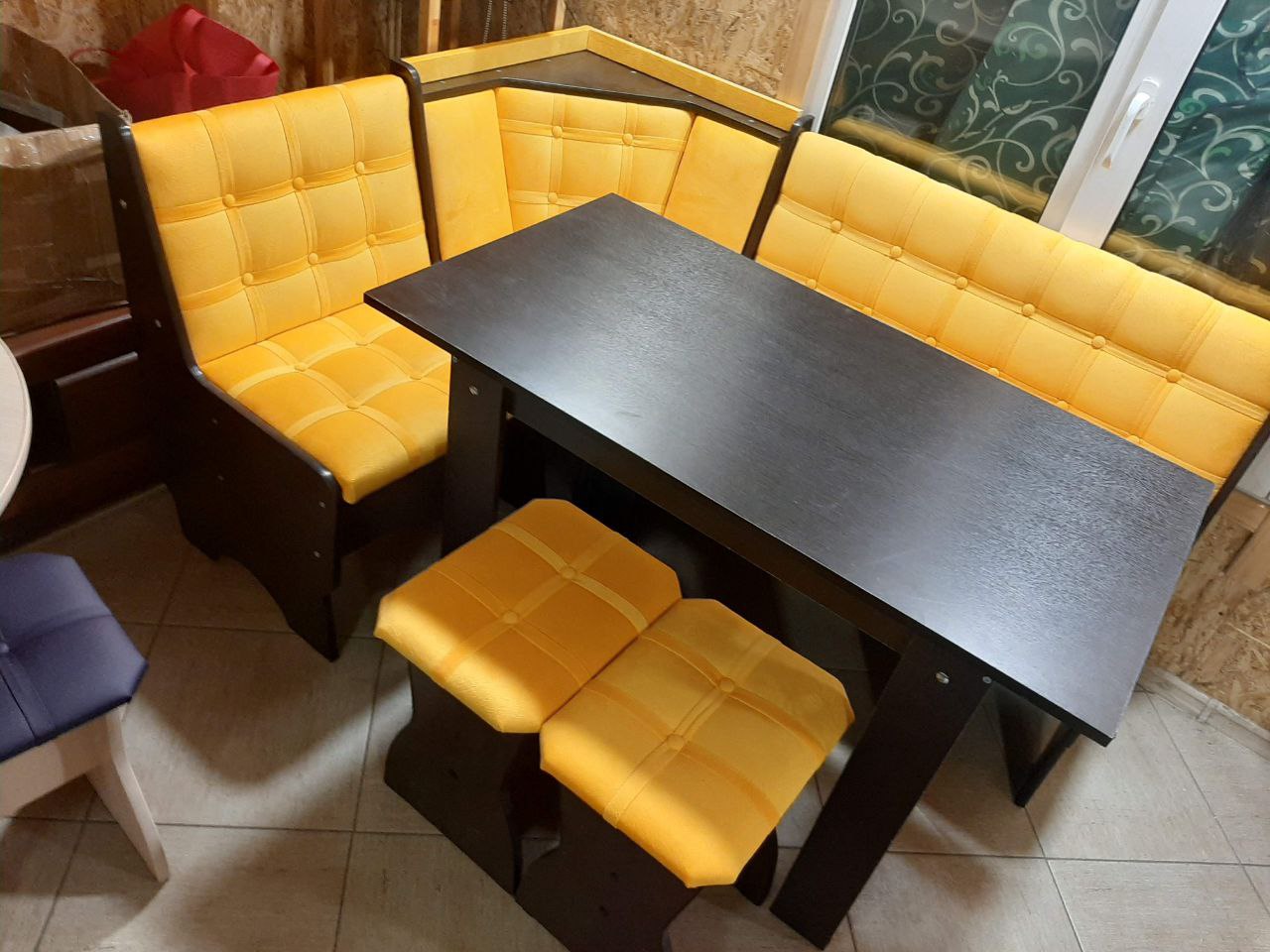 В набор входит угловая скамья, стол и два табурета. Цвет и размер на выбор.