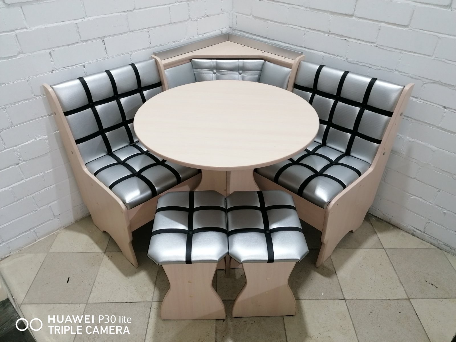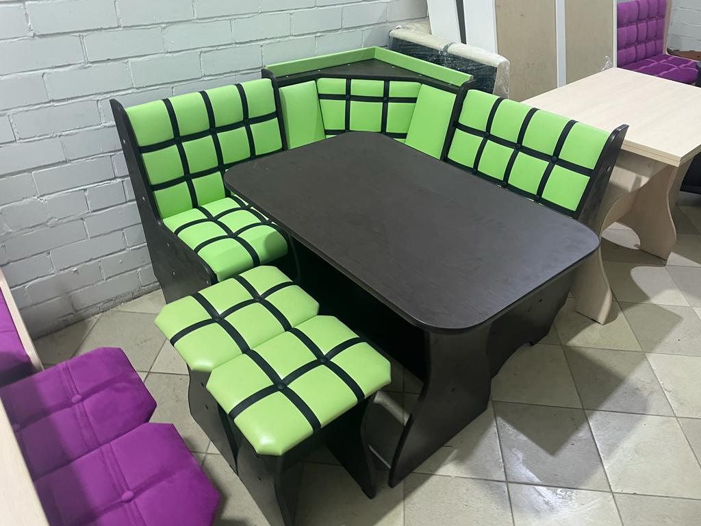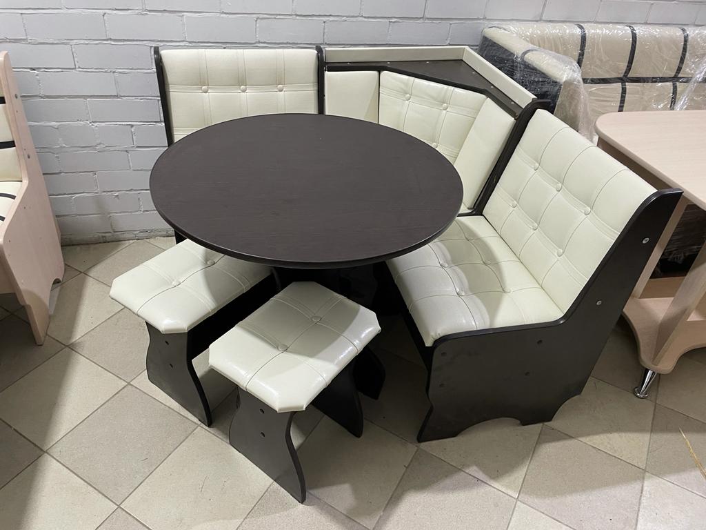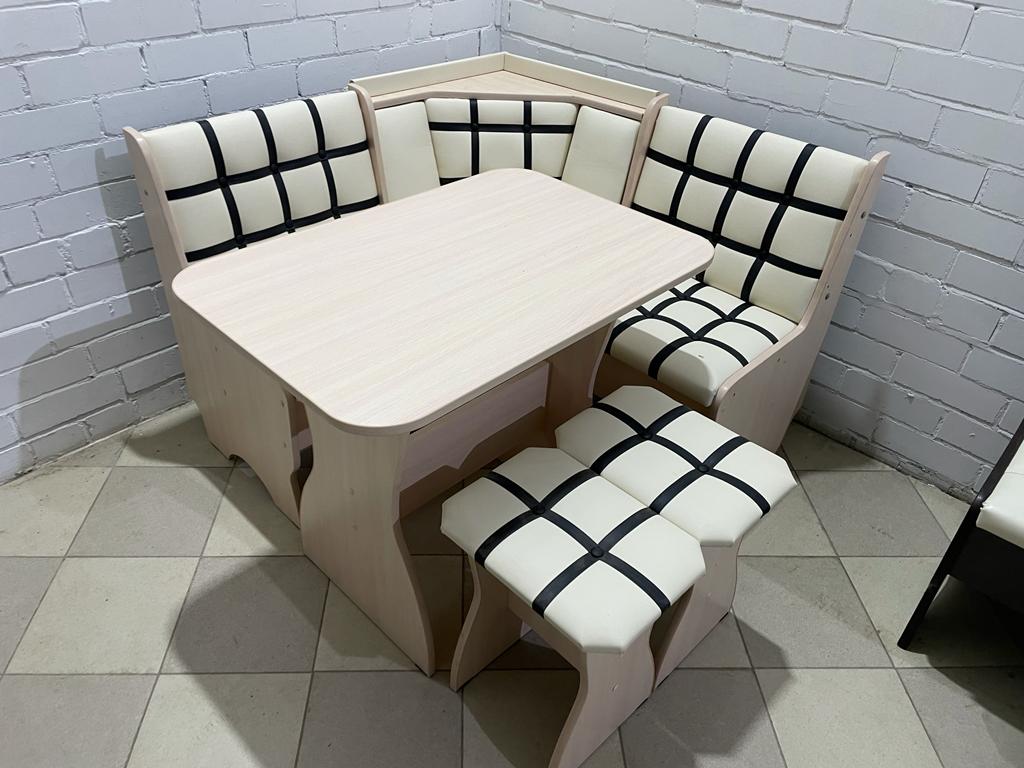 Стильный, функциональный и удобный кухонный уголок, который состоит из: угловой скамьи, стола и двух табуреток.