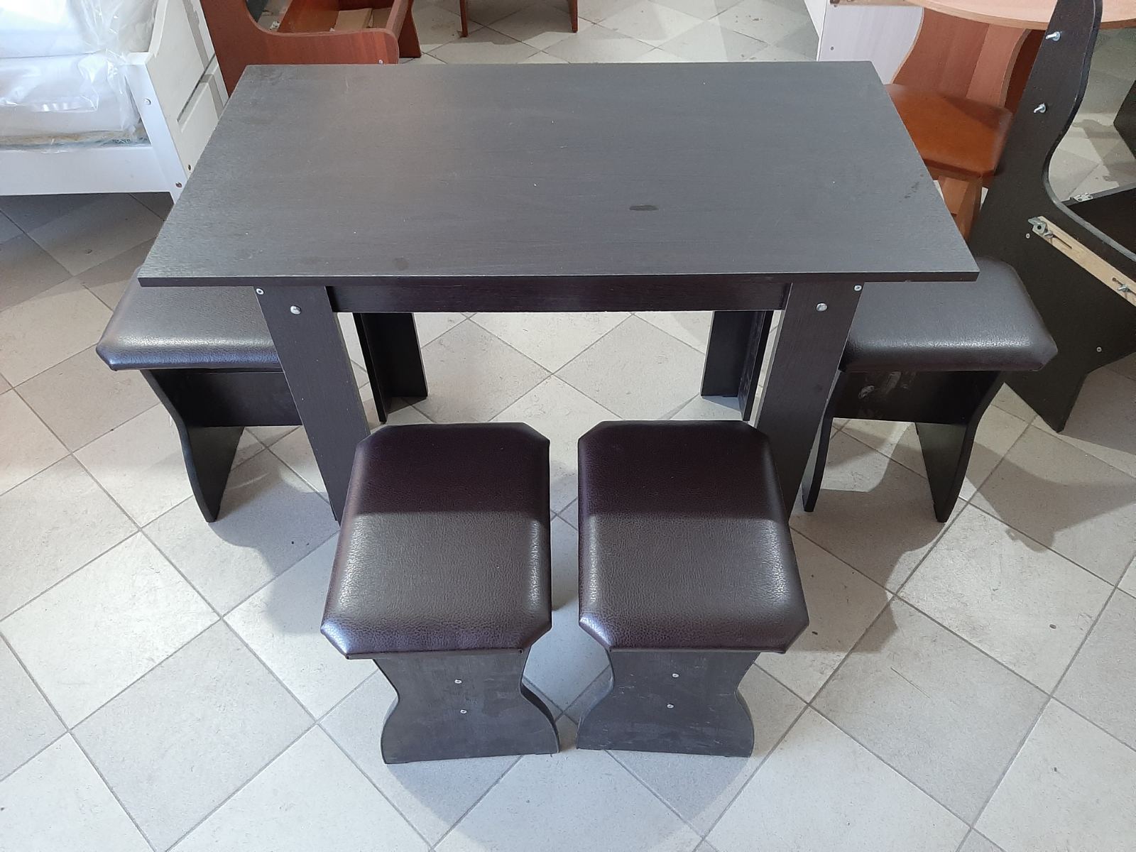 Состоит из углового кухонного дивана, обеденного стола и двух мягких табуретов. Под сиденьем находятся ящики для хранения. Универсальная сборка - право/лево.
