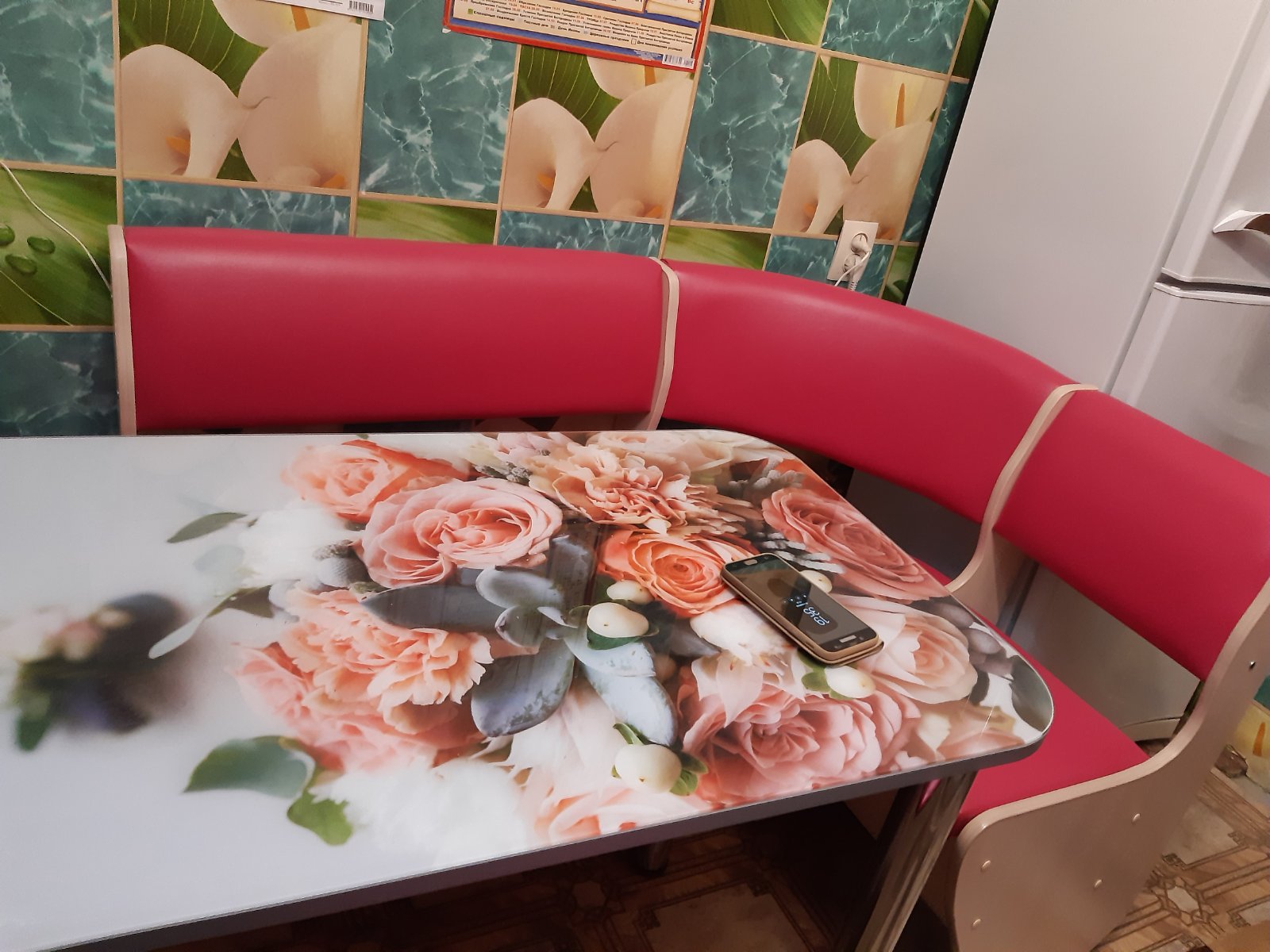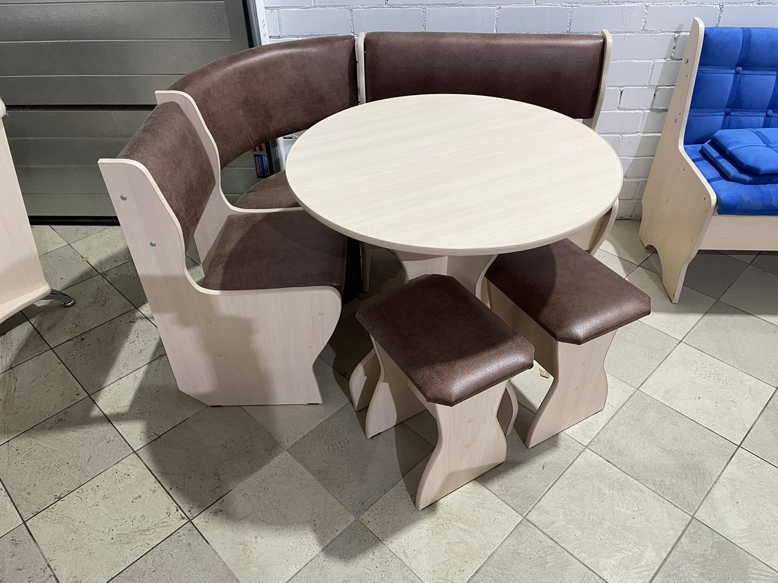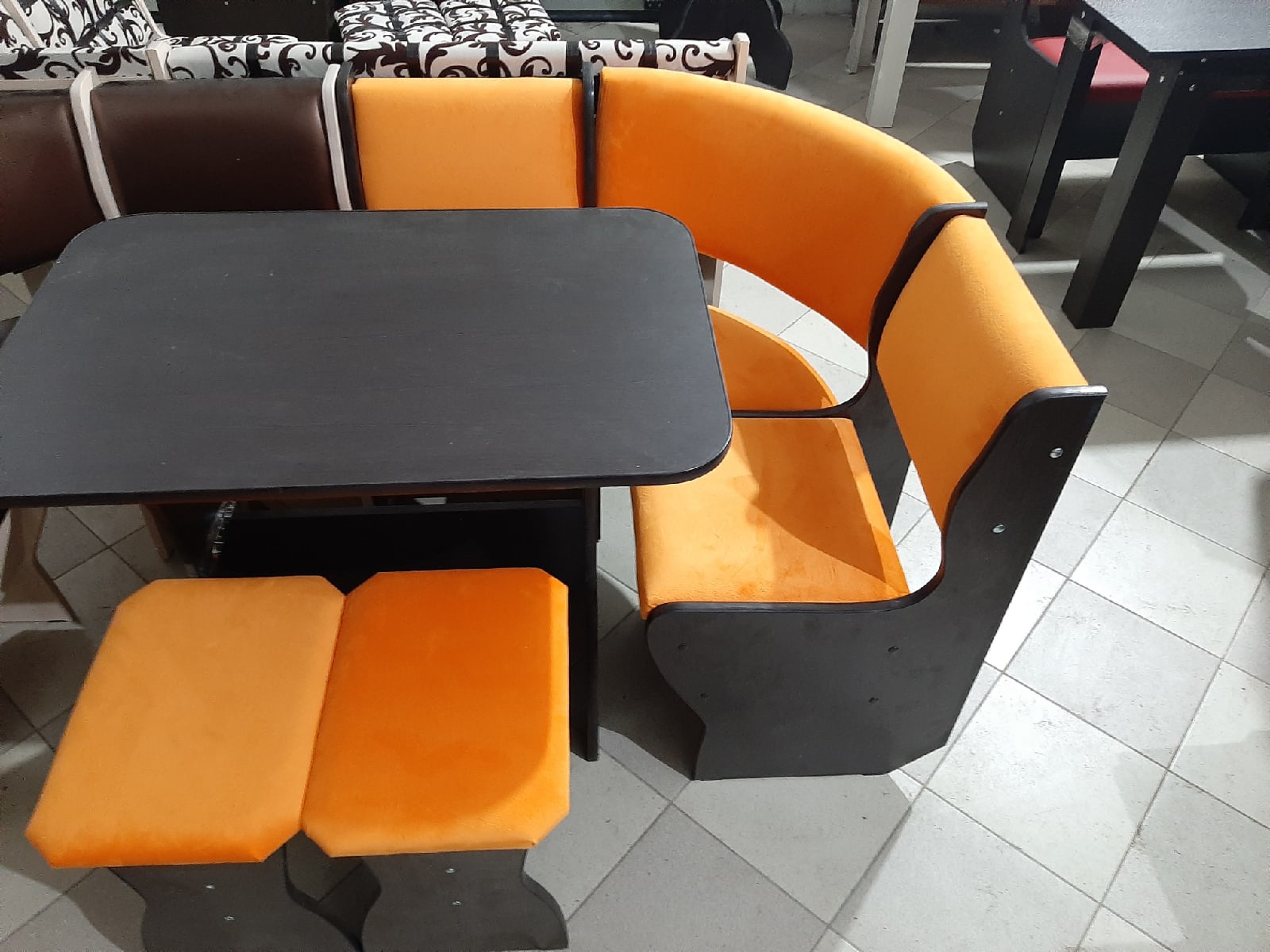 Современный и качественный набор для кухни. В комплекте угловая скамья, стол, два табурета.